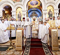 Его Преосвященству сослужили клирики кафедрального собора: протоиерей Павел Цветков, протоиерей Емилиан Починок, священник Антуан Баррос и протодиакон Дометиан (Редко). К ним присоединился священник Богдан Бабенко, который в настоящее время служит в недавно учрежденном приходе в честь святителя Иоанна чудотворца в По, Франция, который прибыл в Женеву по случаю праздника и получил от архиерея новый антиминс и миро для нового прихода, а также различные богослужебные предметы, преподнесенные в дар от Крестовоздвиженского собора.