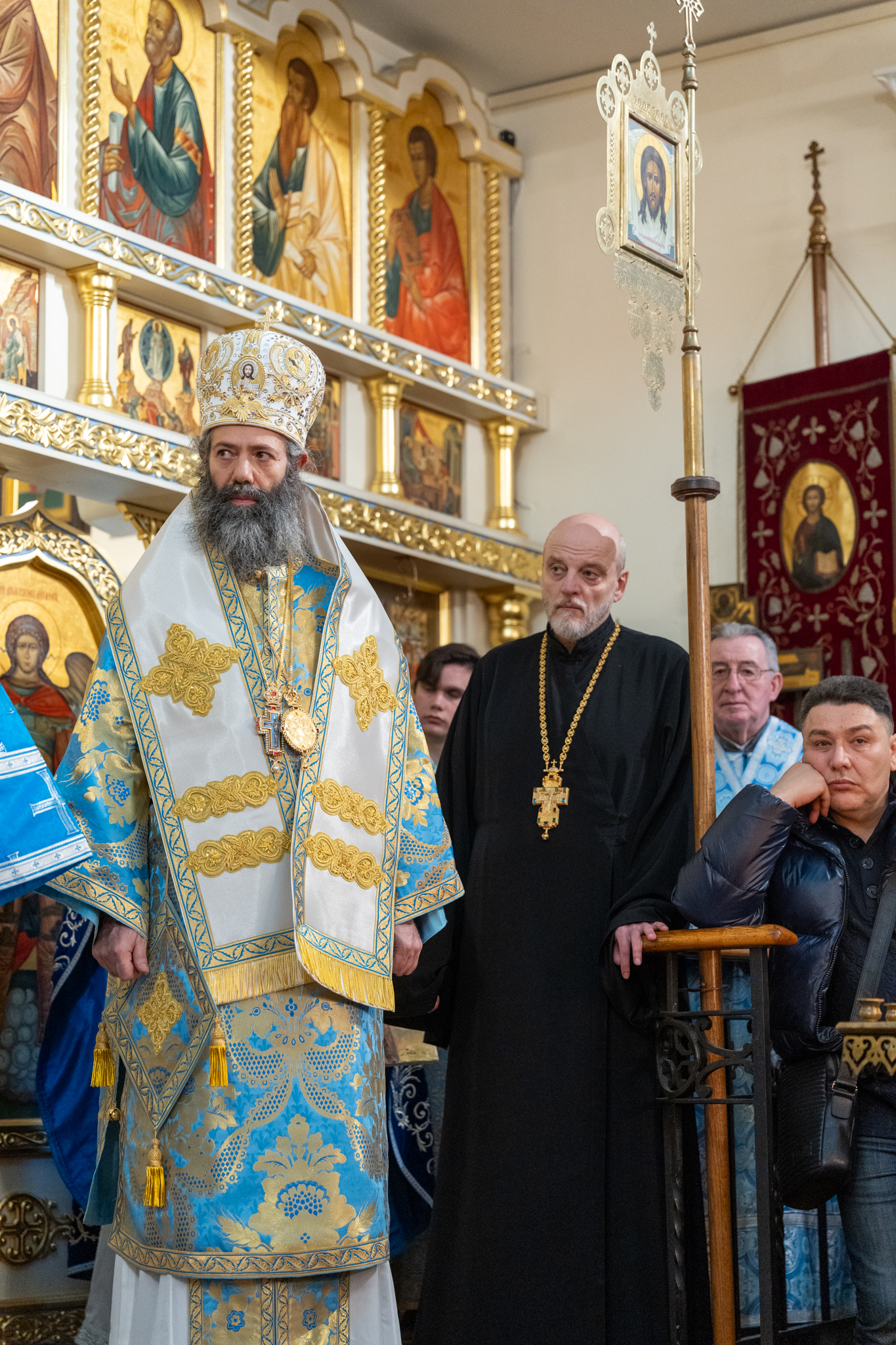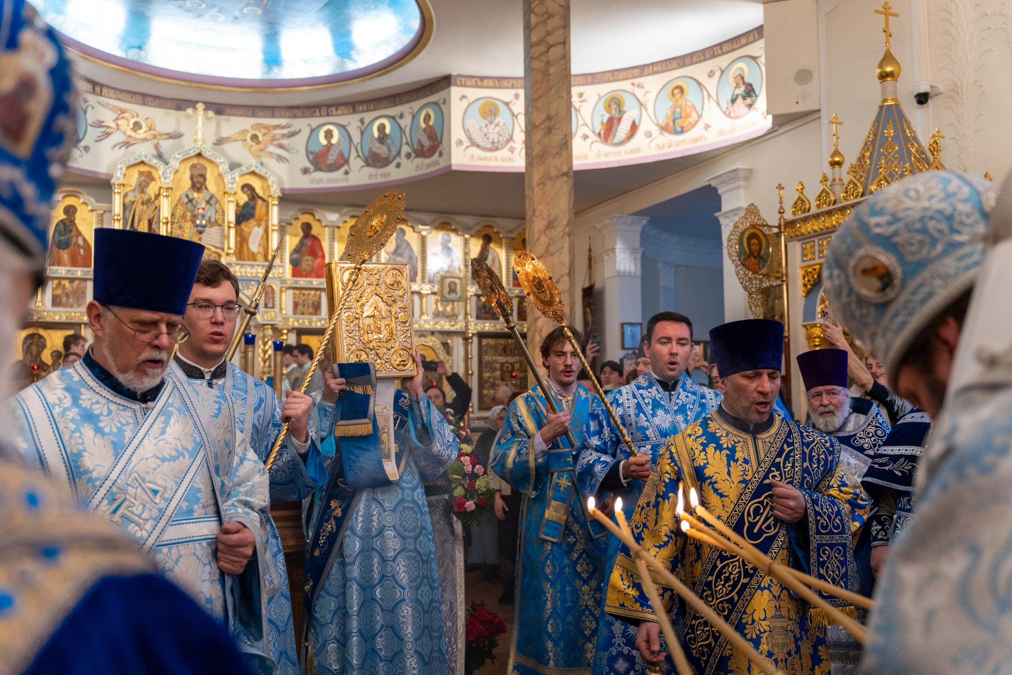 За Божественной литургией верующие, собравшиеся поздравить Высокопреосвященнейшего владыку с днем Ангела, имели возможность поклониться мироточивой иконе Божией Матери "Иверско-Гавайской".