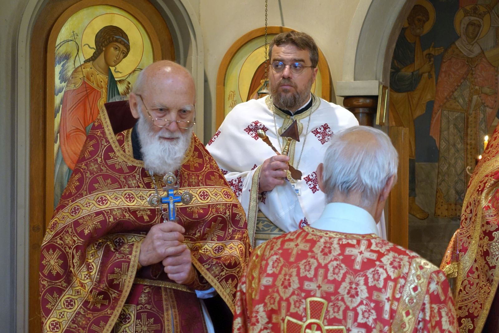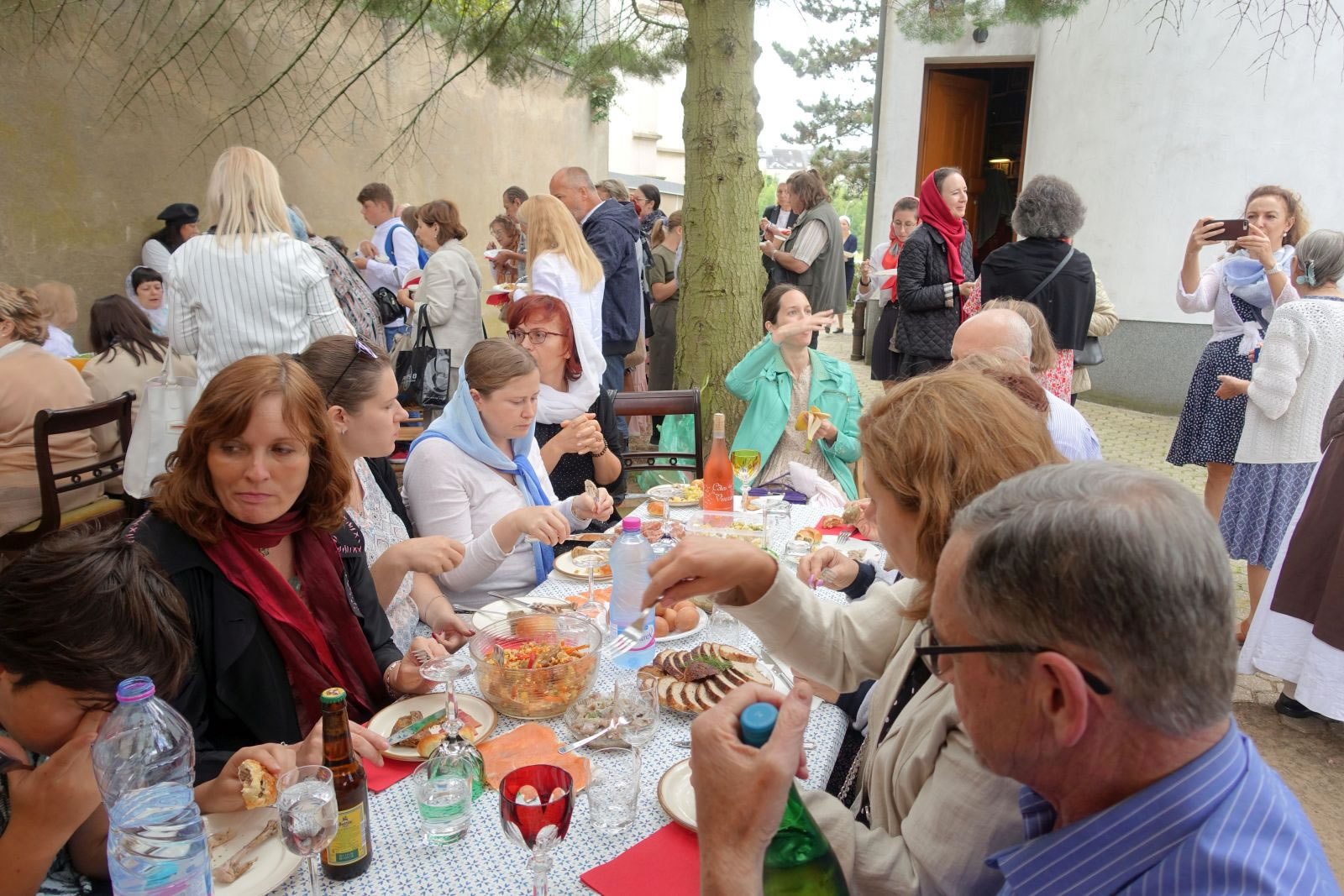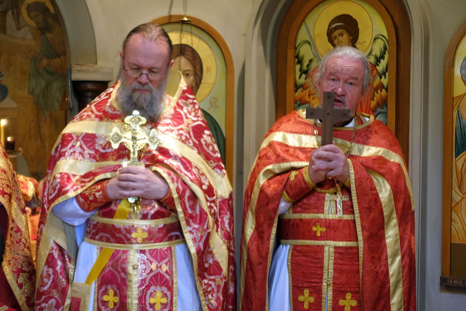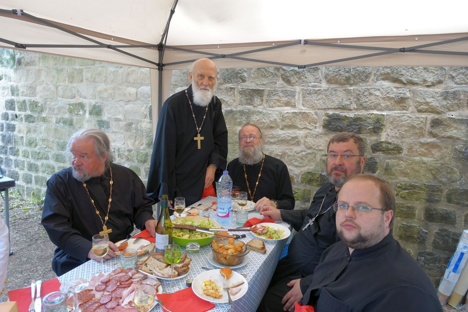 Традиция застолья после больших служб и праздников, положенная чуть не сто лет назад основателями церкви, переходит в новое качество. Разговение после Петровского поста перешло из торжественного празднования в атмосферу чуда, словно все стали свидетелями преломления хлебов. Словно из ниоткуда вырастают столы, полные яств, бокалы, полные вина и родные люди, протягивающие тебе тарелку с лакомым кусочком, который ты заслужил за время поста. Всем дирижирует неутомимый настоятель прихода о. Георгий Машталер, сменивший старого батюшку, строителя храма о. Сергия Пуха, ушедшего на 89 году из жизни на Крещение 2016г. Невидимо поддерживает его староста, вдова о. Сергия матушка Эмилия, на лице которой радость, что дело о. Сергия живет. Крестным ходом завершенная служба и проповедь о. Николая Никишина, приглашенного из Парижа сослужить о. Георгию, еще раз напомнила прихожанам, что вера по Петру и Павлу может быть и богословски твердой, а может быть и твердой в своей незатейливой, но потому и нерушимой простоте.
