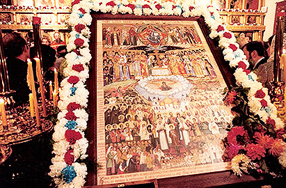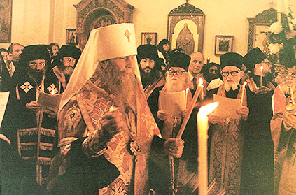 Для служения панихиды из алтаря выходят все присутствующие на Соборе 16 епископов во главе с митрополитом Филаретом, Первоиерархом Русской Зарубежной Церкви совместно со множеством духовенства. На ектеньях читаются кажущиеся бесконечными имена новомучеников: духовенства во главе со Святейшим Патриархом Тихоном, членов Царского Дома Романовых во главе с Государем Императором Николаем II и имена монашествующих и мирян, знаменитых и неизвестных, разного чина и звания, возраста и пола, включая и детей, за Христа принявших мученическую кончину. Эти сотни имен представляют лишь малую часть миллионов страдальцев, за каждым из которых стоит целая история, драма человеческой жизни с годами страданий и мучений, не говоря уже о потерях, разлуках, слезах, оставленности...