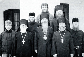 Братия монастыря Преп. Иова в начале 1990 г. Бр. Лаврентий, крайний справа в первом ряду. |