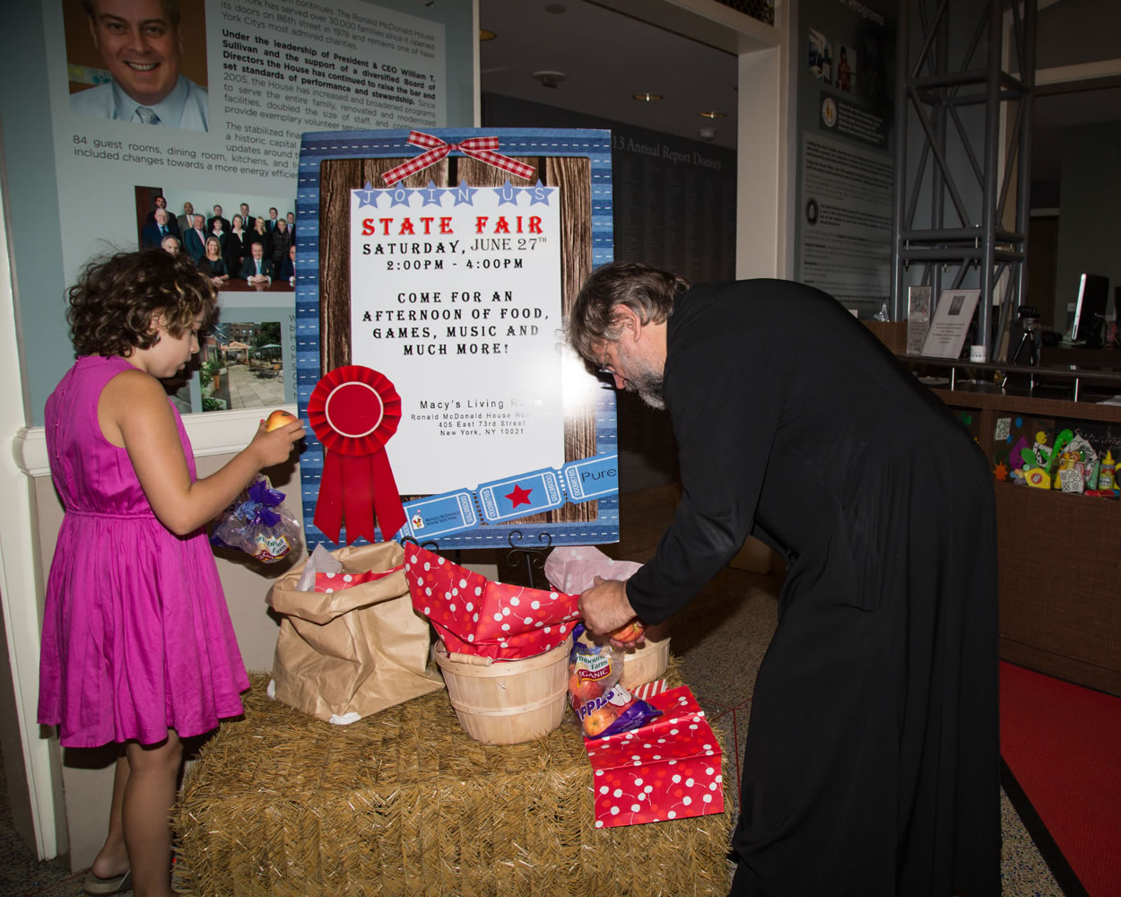 Молодежь была разбита на две группы: первая группа активно принимала участие в уличной продажи книг, игрушек, детской одежды в пользу Дома. Вторая группа занималась подготовкой к мероприятию “Деревенская Ярмарка”, которое проходило с 2х до 4х часов дня. Несмотря на дождливую погоду города Нью-Йорка, волонтеры перенеслись в Техаскую пустыню 19 века, где девушки носят роскошные платья и белые перчатки, а кавалеры ковбойские шляпы и сапоги. В подготовке такого мероприятия, первым делом волонтеры начали наполнять 100 подарочных пакетов для деток. Книжки, раскраски, карандаши, фламастеры, загадки, футболки и даже носки все это входила в подарочный набор для ребенка. Были украшены столы и площадка в ковбойском стиле. Кроме того, что бы создать атмосферу настоящей Америки 19 века, в приемочном зале Дома была созданы эмитация фермы.