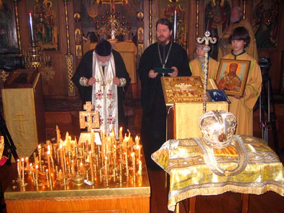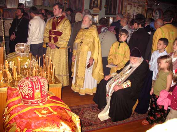After Divine Liturgy, the vestments intended for the Patriarch of Moscow and All Russia, and for Diveevo Monastery, were taken out of the altar into the middle of the church and laid beside the pannikhida table, where Fr Roman led the commemorative service along with Fr Victor, Protopriest Alexei Mikrikov and the parish clergymen. After the singing of Eternal Memory , the Parish Rector then welcomed Fr Tikhon and spoke about the life of Vladyka Philaret. In a moving response, Archimandrite Tikhon noted the importance of this event for the Russian Orthodox Church and gave Fr Roman a pectoral cross from His Holiness, along with an icon of Holy New Martyr Archbishop Ilarion (Troitsky) of Verey, containing a portion of his relics, for Epiphany Church. The choir, under the direction of Vladimir Pavlovich Roudenko, then sang Bortniansky's Tebe Boga khvalim , and for a long time, the multitude of worshipers approached to venerate the vestments of the third First Hierarch of the Russian Orthodox Church Outside of Russia.