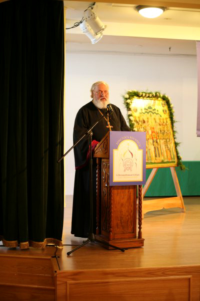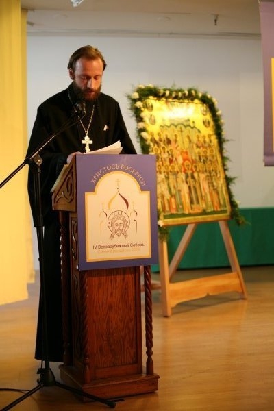 The first speech, "The Spiritual-Historical Heritage of the Russian Church Abroad," was read by Protopriest Nicholas Karipoff, Rector of Protection Cathedral, Melbourne, Australia. Fr Nicholas said that from the very first day, ROCOR saw herself as the preserver of spirituality and of proper ecclesiastical life. The speaker is convinced that the ROCOR will bring benefit to Russia if she finds courage to speak honestly, not haughtily, without losing her repentant spirit. The speaker recalled that the founder of ROCOR, Blessed Metropolitan Anthony (Khrapovitsky), taught that Orthodoxy is first and foremost a religion of repentance. The legacy left by the bishops and clerical guides of ROCOR dictated that the proper order of Church life be preserved for the Russian Church, an order that could not be preserved in the Church in the Fatherland which was oppressed by her enemies. While the bishops abroad thought of themselves as sufferers for the Church of Russia, the Lord preserved the spirit of ROCOR unharmed. When the course of exclusivity, of self-satisfaction was later taken, the ROCOR began thereby to sin against the legacy of her founding fathers. "The repentant return onto the original path will not only help us, but the entire Russian church, to return to the sober and healthy life of the Church of Holy Russia, the Church of the Pan-Russian Council of 1917-1918, the Church of the Holy Martyrs," said Fr Nicholas.