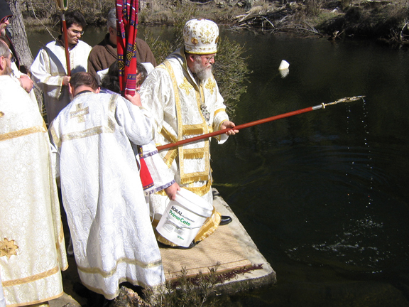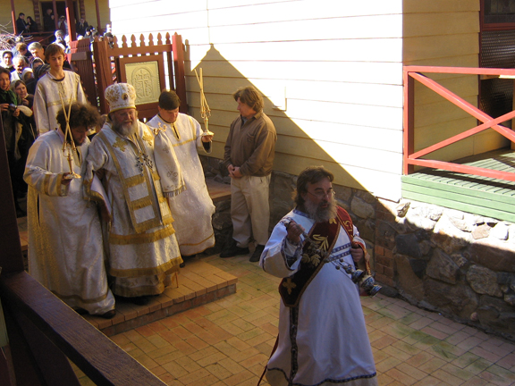 At the end of the solemn services, His Eminence, the clergymen and worshipers descended in a procession of the cross to the river, where the water was blessed, after which Vladyka Hilarion read the prayer for the blessing of the fruits, held in from of the entrance to the monastery. Before the veneration of the cross, Many Years was intoned in accordance with the monastic rule, after which everyone was invited for refreshments offered by the monastery brethren, aided by pilgrims from all over, numbering some 130 (the Monastery usually draws many pilgrims on its feast day).