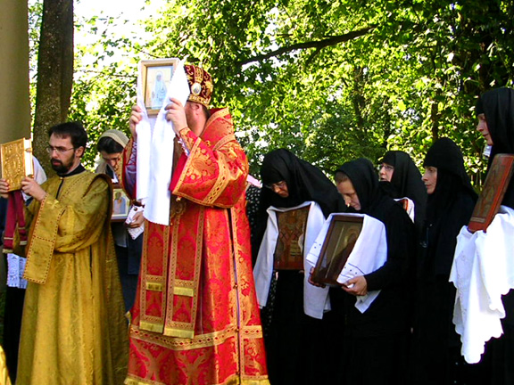 On July 18, the Convent of St Elizabeth the Martyr celebrated its first feast day. The solemn all-night vigil was conducted by Protopriest Nikolai Artemoff with Deacon Alexander Rolov. Arriving from Darmstadt in time for the polyeleos was His Grace Bishop Agapit of Stuttgart. The next day, the spiritual father of the Convent was greeted before Liturgy—His Eminence Archbishop Mark. The spirit of the Resurrected Christ, fittingly for the memory of Holy Grand Duchess Elizabeth, reigned at her Convent. The church was adorned in red vestments and red Paschal candles burned throughout the church; it was all reminiscent of a little Pascha. After Divine Liturgy, there was a procession of the cross around the Convent. Afterwards, the nuns invited all the pilgrims to a festive trapeza, during which Vladyka Mark congratulated the nuns on their first feast day. His Eminence noted that from now on in the German Diocese, women, too, will have a monastic retreat where they can draw strength and spiritual edification, sadly lacking until now. Women pilgrims can now visit the new convent and combine monastic labors with prayer, attending the daily services.