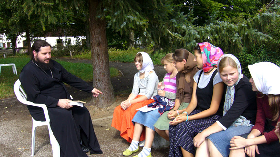 The camp opened with a moleben. Hieromonk Evfimii (Logvinov) from St Job of Pochaev Monastery in Munich served on the feast day of St Seraphim of Sarov. The arrival at the Convent of the Ruling Bishop of the Diocese, His Eminence Archbishop Mark, brought us great joy; Vladyka served all-night vigil and Divine Liturgy on the feast day of Holy Prophet Elias, along with Fr Dimitry Kalachev of Billefeld. The children were given the opportunity to participate in the daily services, confess and partake of the Holy Mysteries, and also made new friends. The first half of the day was devoted to studies in Church Slavonic, icon-painting, liturgical singing, and also 30 minutes of reading of the Gospel and discussion under the open sky. After lunch, the girls would swim in the lake, and made a pilgrimage to St Job of Pochaev Monastery. Unfortunately, because of foul weather, the scheduled horseback riding session was canceled. The remaining time was devoted to drawing and arts and crafts. After evening trapeza, the participants were shown videos on monasteries and other holy sites. The daily monastic way of life enhanced the orderly mood of the camp. On Friday, August 4, after an akathist before the myrrh-streaming "Donskoy" icon of the Most-Holy Mother of God, everyone departed for their homes. It was a joy to hear the children express the desire to meet once more next summer in Buchendorf. Plans are for the Camp of SS Martha and Maria to be held every summer at the Convent. In response to the wishes of the parents, the dates of next year's camp will be provided well ahead of time.