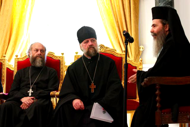 The audience with the head of the Jerusalem Patriarchate lasted over an hour. Throughout, His Holiness Patriarch Theophilos freely shared his thoughts on how essential it was for Orthodox Christians to constantly struggle to make the Church the center of their lives, and his ideas on how best to oppose secularism and globalization. The leader of the Jerusalem Church said that he was watching attentively the process of unification of the Russian Church. He emphasized that as soon as that process was completed, the clergy of the Russian Orthodox Church Outside of Russia would be allowed to concelebrate in the churches of the Jerusalem Patriarchate.