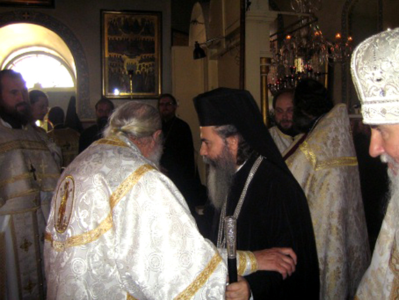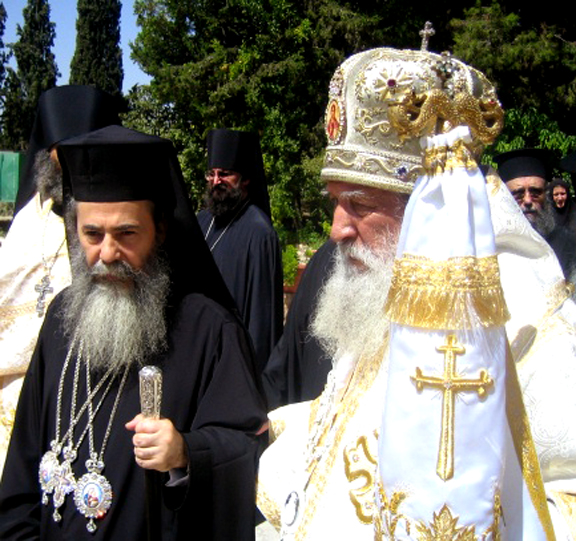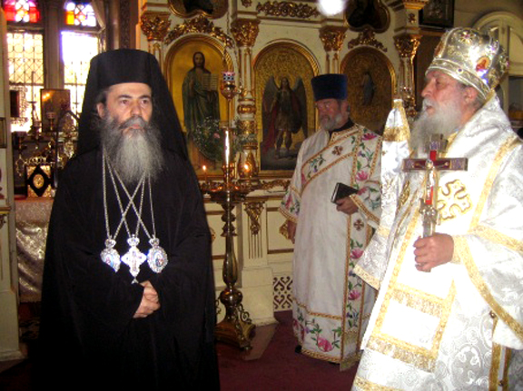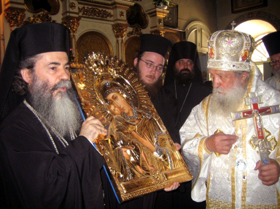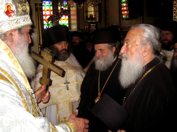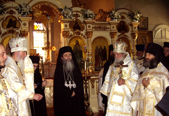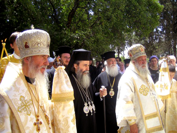 "Your Eminence, Eminent Vladyko! Your Eminence, dear in the Lord fathers, brothers and sisters! Today the grace of the Holy Spirit has gathered us to lift our prayers of gratitude to God, who granted us His great mercies. We rejoice in greeting you on this day of celebration. During a recent meeting with His Eminence Vladyka and the members of the delegation of the Russian Orthodox Church Outside of Russia, we heard about the progress of discussions between both parts of the Russian Orthodox Church. On behalf of our Holy Synod and the Brotherhood of the Holy Sepulchre, I wish to express our joy that the division in the Russian Church is being overcome, which resulted from the sin of man. We hope that communion and unity are restored in the near future. The fact that such a large contingent of our Holy Church is in attendance today attests to our support for this great and holy work, to our readiness to help in whatever way possible in the manifestation of the unity everyone desires. We also hope that other Orthodox Christians follow the example of the Russian people and begin to overcome their divisions and quarrels within their own Churches. Once again I congratulate you all and as a symbol of our love to the monastics of this holy convent, I ask that you accept this icon of the Theotokos, which was painted in Russia. May She preserve all of you and grant you the peace of Christ."
