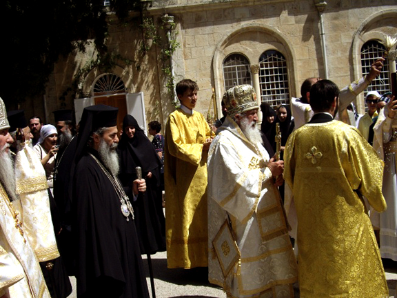 "On this important and holy day, I extend my heartfelt greeting to His Holiness Patriarch Theophilos, who prayed with us today, and on behalf of our Russian Ecclesiastical Mission in Jerusalem I wish to express to you, Holy Vladyka, profound gratitude for your paternal care for our monastics and clergymen who labor in these holy monasteries. I also thank the members of the Holy Synod of the 'Mother Church' and the Brotherhood of the Holy Sepulchre and wish them spiritual peace and joy in their service to our Chief Pastor, Christ. I am also happy to greet the Overseer of our Mission, His Eminence Archbishop Mark, the Very Reverend Abbess Moisseia and the nuns of this convent and all our clergymen, headed by Hegumen Andronik.