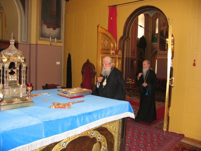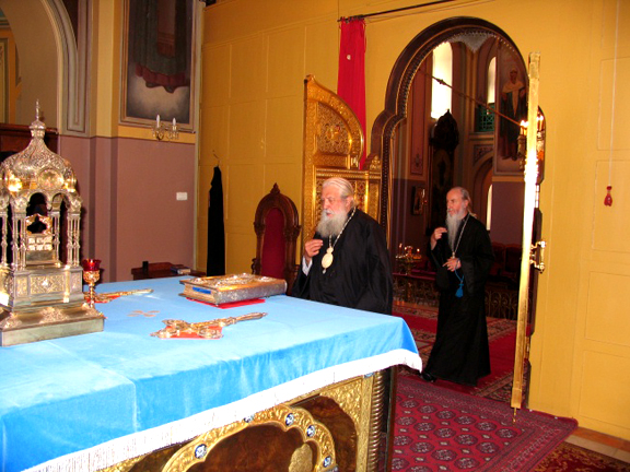 Metropolitan Laurus, Archbishop Mark and the Delegation of the Russian Orthodox Church Outside of Russia Delegation Visit Holy Trinity Cathedral and the Mission of the Moscow Patriarchate  On August 28, the Dormition of the Most-Holy Mother of God, His Eminence Metropolitan Laurus, along with His Eminence Archbishop Mark of Berlin and Germany, Overseer of the Russian Ecclesiastical Mission in Jerusalem; Hieromonk Nicholas (Perekrestov), Secretary of the Mission; and the members of the delegation of the Russian Orthodox Church Outside of Russia visited the Russian Holy Trinity Cathedral in Jerusalem. Here, His Eminence Vladyka Metropolitan was greeted by the Head of the Mission of the Moscow Patriarchate in Jerusalem, Archimandrite Elisey (Ganaba), who gave a tour of the Cathedral's holy items.
