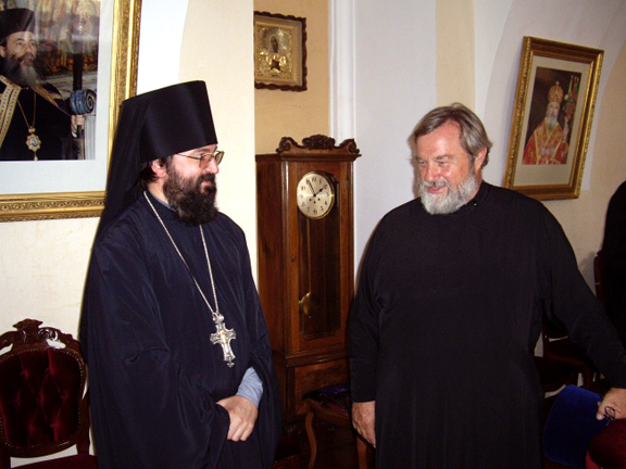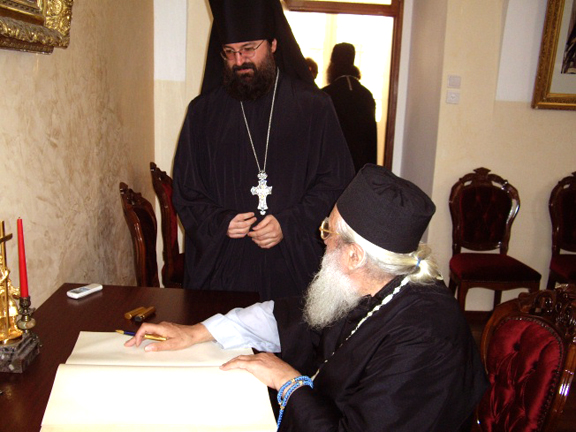 Greeting His Eminence, Fr Elisey called the visit to Holy Trinity Cathedral a symbol of the inner unity of the children of both parts of the Russian Orthodox Church and expressed joy that the Head of the Russian Orthodox Church Outside of Russia prayed at the holy places of this Cathedral on this holiday, which, he hoped would lead Russian Orthodox Christians to full prayerful and Eucharistic unity. In his response, His Eminence thanked the Head of the Mission of the Moscow Patriarchate for the invitation and wished him Divine help in his service. Then the visitors proceeded to the Mission's headquarters, where Fr Elisey offered a luncheon in honor of the First Hierarch of the Russian Orthodox Church Outside of Russia and the individuals accompanying him. Archimandrite Elisey then told His Eminence Metropolitan Laurus, His Eminence Archbishop Mark and the other visitors about the joys and difficulties of the Mission of the Moscow Patriarchate in the Holy Land.