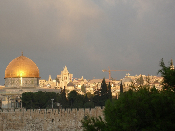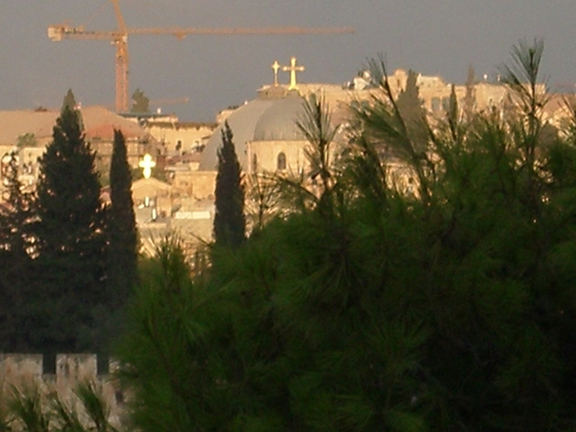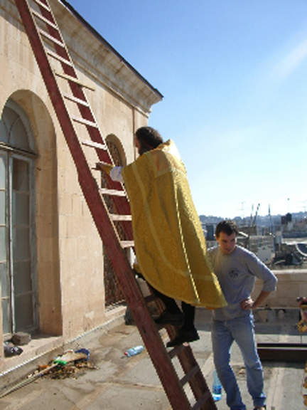 It is morning in the Holy Land. The sun rises over the Moab Mountains and Jerusalem is transformed into a golden city. There exists no more beautiful sight than the first moments of dawn in the Holy City of the Resurrection, especially when dark clouds still hurry across the sky. One stands in awe and praises God. Against the backdrop of this golden city, a large Orthodox cross above the Church of St Alexander, (known as the "Russian Excavations," the property of the Orthodox Palestine Society) suddenly shines forth like a morning star. The cross is clearly seen from the Mount of Olives, and from Gethsemane. A few days ago, on the feast day of St Alexander, its gilding completed, it was ceremoniously blessed. This was an historic, important event. This cross stands in the very heart of Jerusalem, near the Church of the Resurrection of Christ. The "eight-pointed" bronze, gilded cross stands three meters tall and adorns the Holy City as a symbol of Russian Orthodoxy in the Holy Land. Hieromonk Nicholas (Perekrestov), Secretary of the Russian Ecclesiastical Mission in Jerusalem, was given the honor of performing the rite of consecration. Reading the proper psalms with trembling, we utter the words: "Let us enter God's dwelling; let us worship at God's footstool," and "Exalt the Lord our God and worship at His holy mountain." As we stand on the roof of the church, to the left is the dome of the Sepulcher of the Lord, Golgotha nearby, and underneath us is the Judgment Gate, through which Christ was led to the "Place of Skulls."