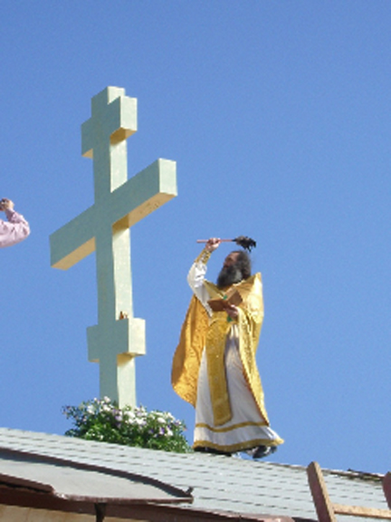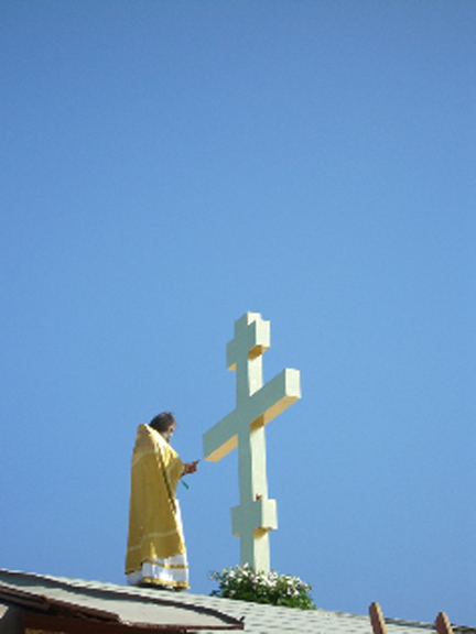 Fr Nicholas ascends a ladder to the cross itself. The nuns and faithful remain in place. The consecration lasts for almost an hour. Afterwards, we are all given the opportunity to climb up to the cross, but only a few do so. The ascent is fraught with danger. We are worried: could Fr Nicholas, in full vestments, climb down safely? But thank God, he does. Afterwards we all descend to the church for Divine Liturgy, which begins unusually late (at 9:30 am). The church's acoustics are magnificent; it is easy to sing here. And the holiness of the site fills the soul with blessedness. Considering the fact that it is a workday, a good number of people gather, and almost everyone partakes of the Holy Gifts. Afterwards, church members offer a trapeza for the clergy and monastics. We thank God for His great mercy!