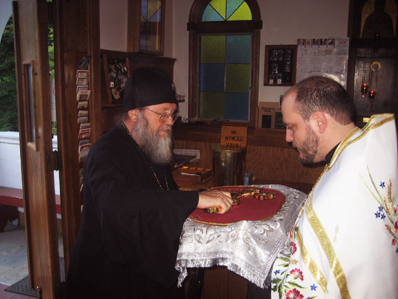 In his reply, His Eminence recalled the ever-memorable Bishop Mitrofan of Boston, who had for many years been the rector of the parish, and prayerfully wished the rector strength to bear his pastoral duties; and for the clergy, parishioners, and those who were there to pray, peace, unity, and consolation as they pray together in the church. Fr Serafim then acquainted His Eminence with plans for the adornment of the church, which he had presented previously to the members of the Parish Council, and showed him the parish's treasured holy objects. These included the kamilavka of St John of Kronstadt, which had been preserved for many decades in the family of the Rector; as well as a great many portions of the relics of the saints. Having invoked the blessing of God upon the clergy and parishioners and bade them farewell, His Eminence proceeded to the rectory, where, with Fr Michael and Fr Serafim, he received visitors. Later, at the residence of the Shohov family (relatives of the late Bishop Mitrofan) a reception was given in honor of the First Hierarch.