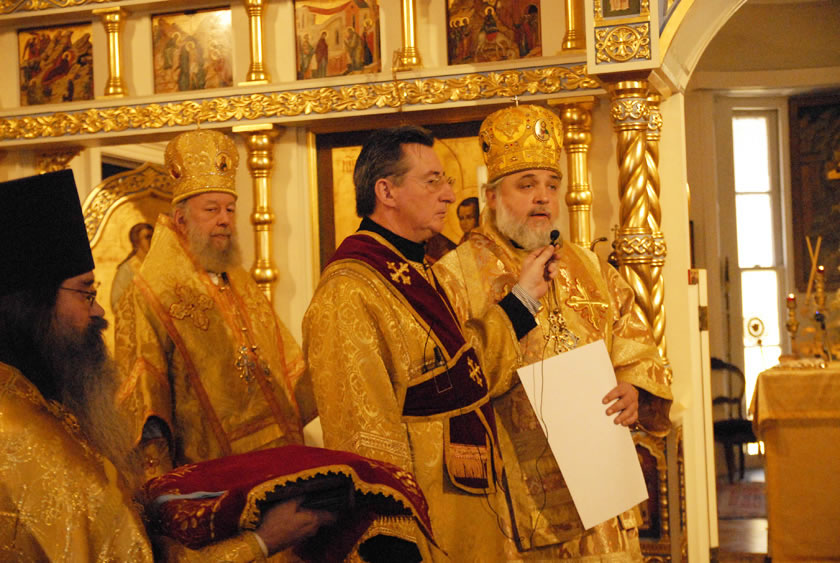 On November 3, 2009, the feast day of St Hilarion of the Kiev Caves, the Synodal Cathedral of Our Lady of the Sign in New York marked the namesday of His Eminence Metropolitan Hilarion. Vladyka Hilarion celebrated Divine Liturgy on this day along with His Grace Bishop Gabriel of Montreal and Canada, as well as his vicar bishops, His Grace Bishop George of Mayfield and His Grace Bishop Jerome of Manhattan, as well as clergymen of the diocese and visiting priests. At the end of divine services Vladyka Hilarion was given the highest honor of the Russian Orthodox Church Outside of Russia, the Kursk-Root Medal of the First Order, to mark the 25th anniversary of his archpastoral consecration. The parishes of the Eastern American Diocese also gave him gifts of a cross and panaghia. Afterwards, the participants of the celebration were offered an abundant trapeza luncheon, during which speeches were made honoring His Eminence.