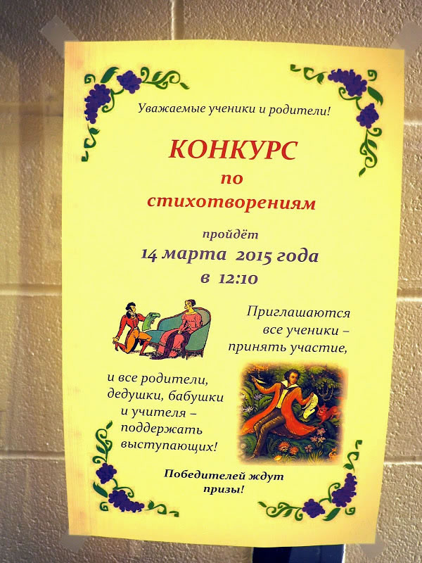After prayers, Vladyka Nicholas had lunch with the students in the parish hall, after which a photo of Vladyka and the school was taken. This was followed by the annual poetry-reading competition in which 34 students participated, the younger ones reciting works by Marshak, Barto, Nikitin, the older students rendering the works of Pushkin,Lermontov and Esenin, plus their own poems. Facing the difficult task of selecting the competition winners was the jury, comprised of Protopriest Yaroslav Belikov (Law of God teacher), Elena Kelly (teacher of Russian and Russian history), and 2014 graduate Xenia Kudinova, who is now an assistant teacher.