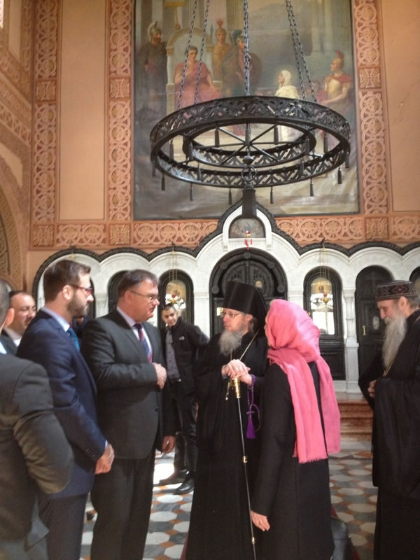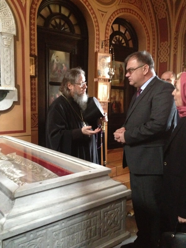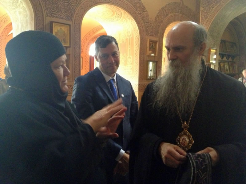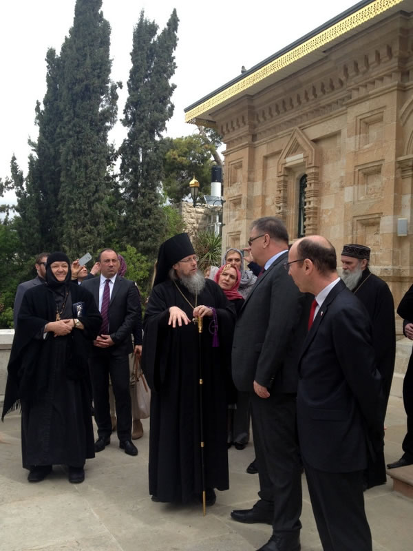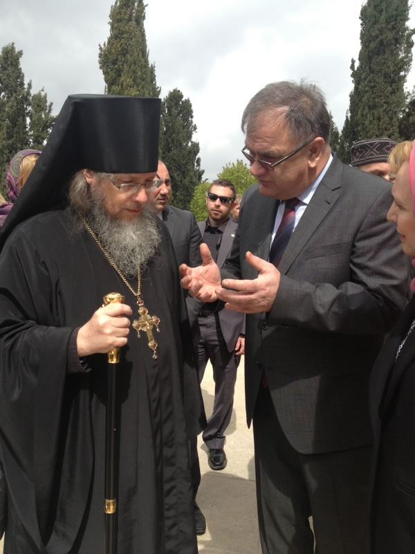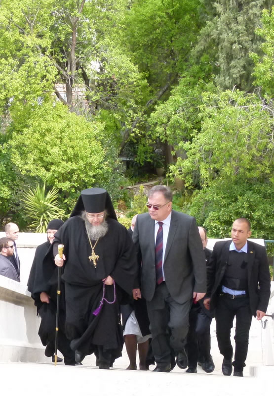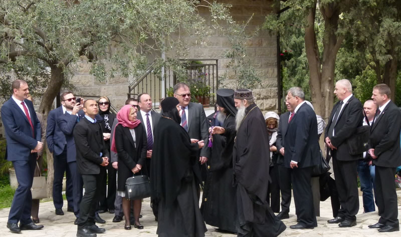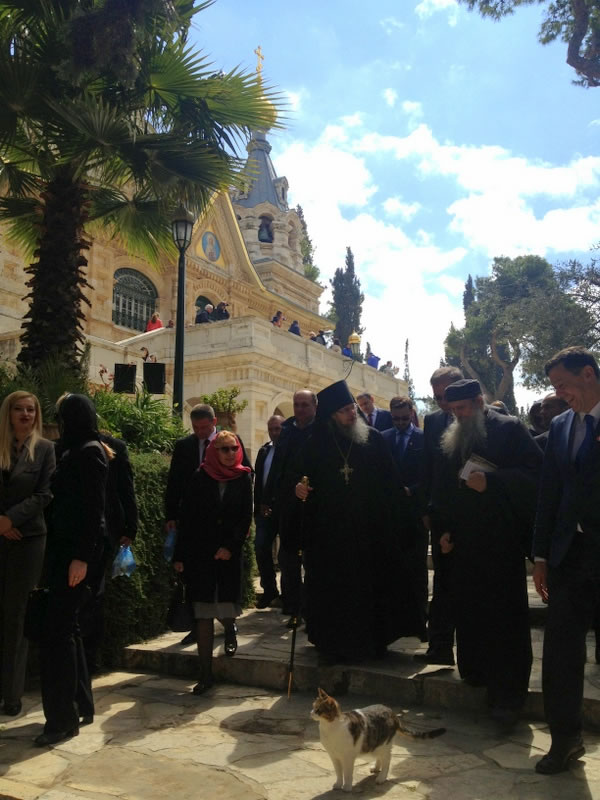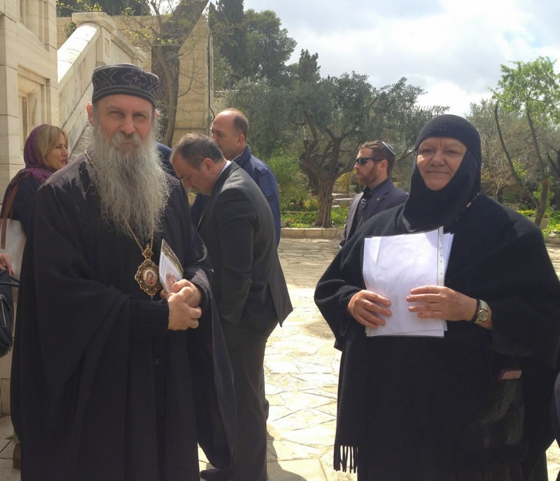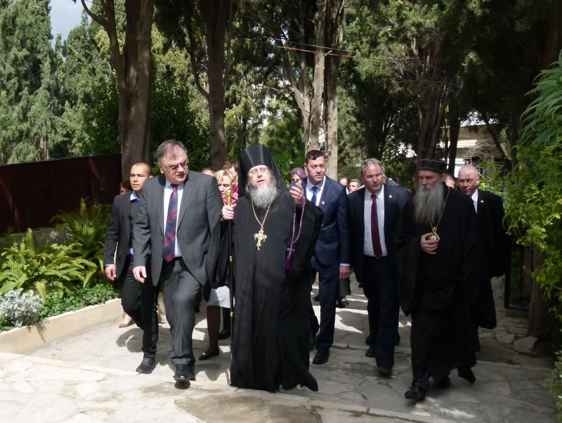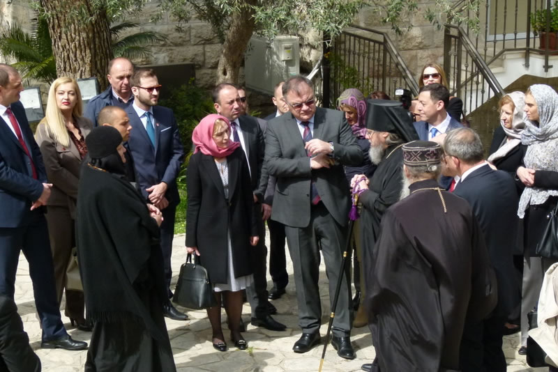 On Tuesday, March 14, 2017, Mladen Ivanic, President of the Presidium of Bosnia and Herzegovina, and his wife visited Gethsemane Convent in Jerusalem. The lofty guest was accompanied by His Grace Bishop Jovan of Lipljan (Serbian Orthodox Church), and dignitaries of Bosnia-Herzegovina and Israeli officials. They were welcomed by Archimandrite Roman (Krassovsky), Chief of the Russian Ecclesiastical Mission in Jerusalem of the Russian Orthodox Church Outside of Russia, and Abbess Elizabeth (Smelic) of St Mary Magdalene Convent, at the “Royal Church” of the convent, where the pilgrims venerated the relics of Holy Grand Duchess Elizaveta and Nun Barbara and other saints.