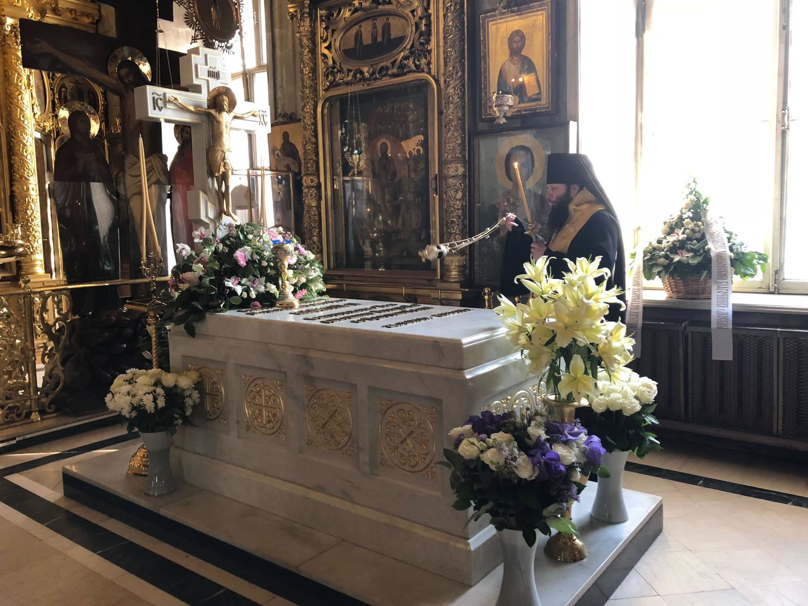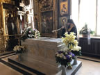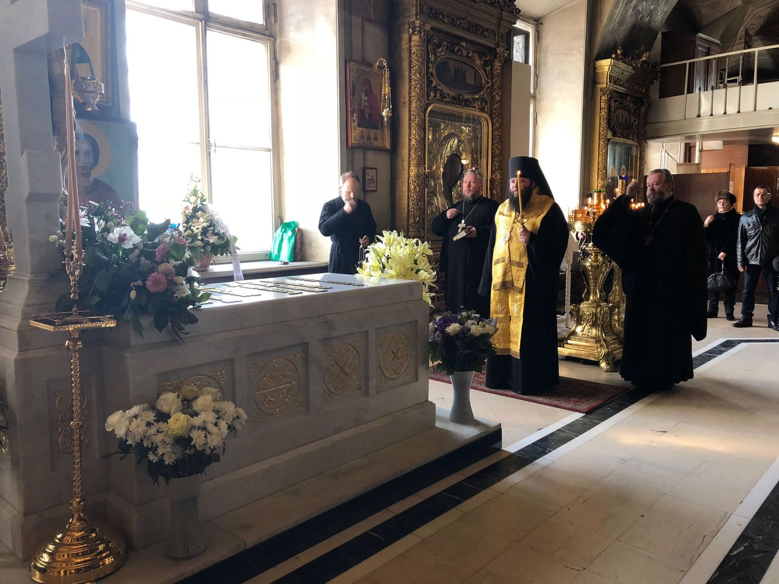 The delegation then headed for Danilov Monastery, to the residence of His Holiness Patriarch Kirill. Having presented the proper documentation, they received Holy Myrrh. The necessary paperwork for export was prepared, after which Bishop Nicholas and Fr Alexander headed for Bogoyavlensky Cathedral. Here, Protopriest Alexander Ageikin, the Senior Priest, welcomed them. After venerating the relics of St Alexei, Metropolitan of Moscow, Bishop Nicholas performed a pannikhida at the tomb of His Holiness Patriarch Alexy II of Moscow and All Russia, also commemorating Metropolitan Laurus, the late First Hierarch of ROCOR, and others.