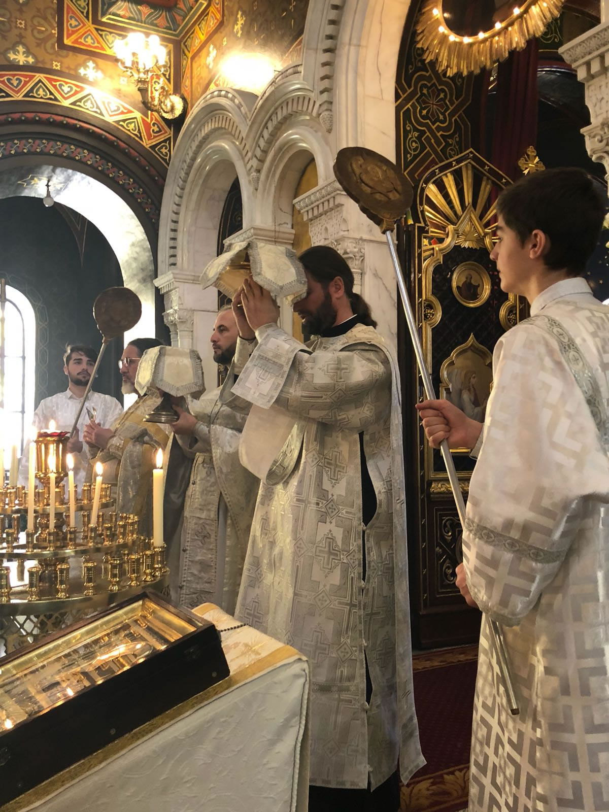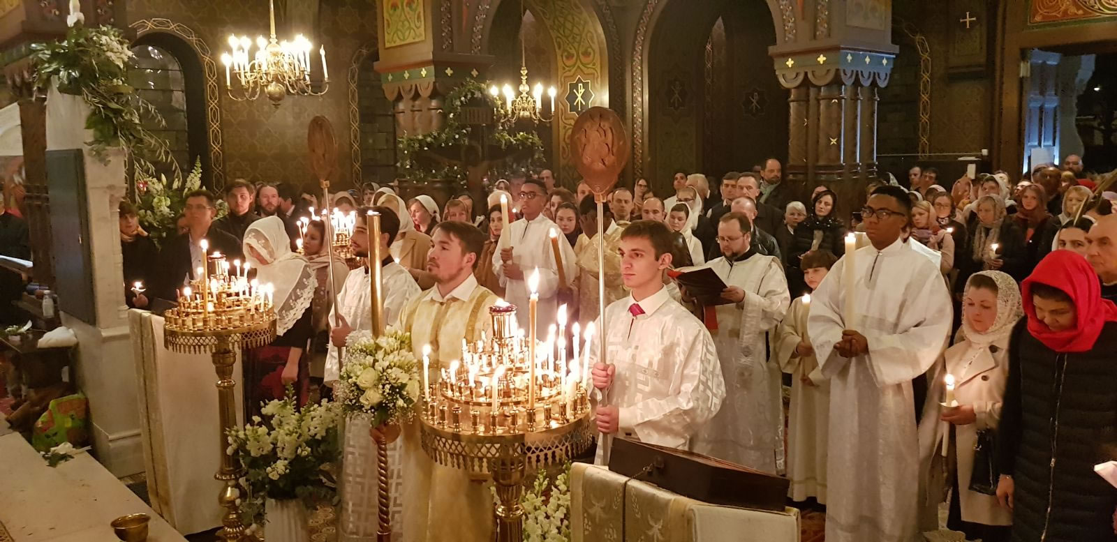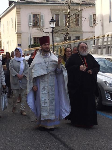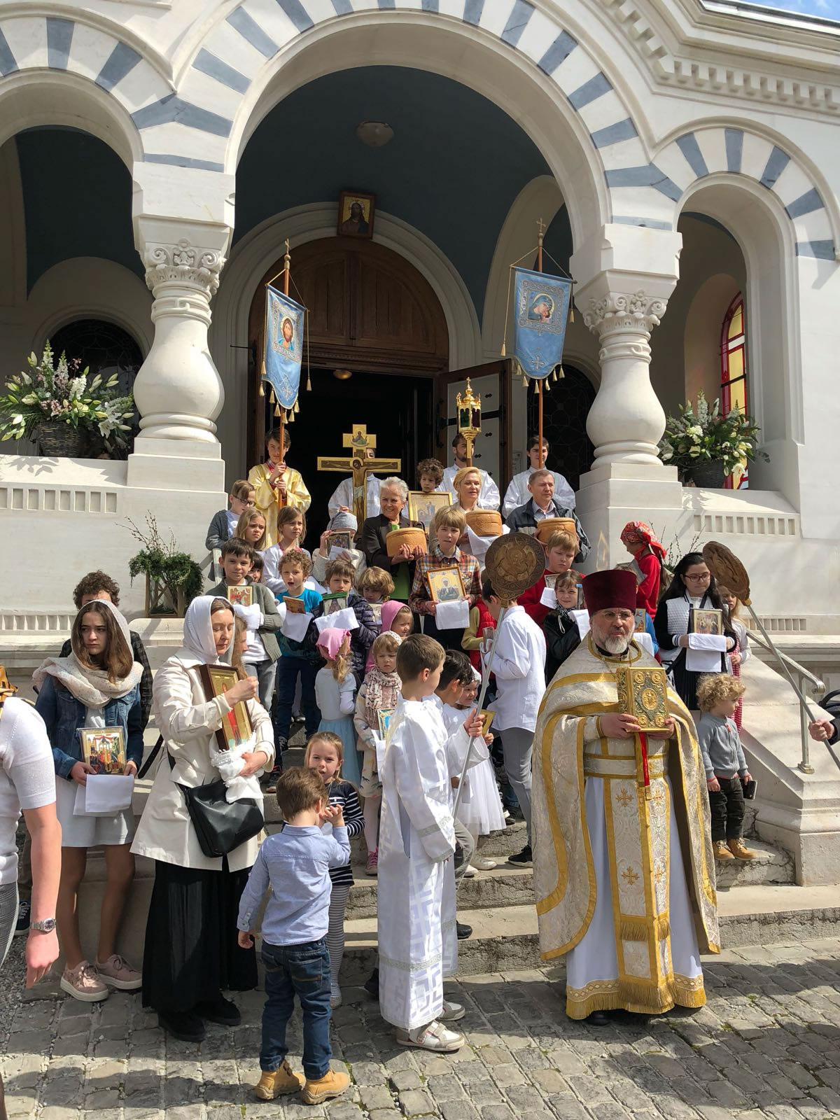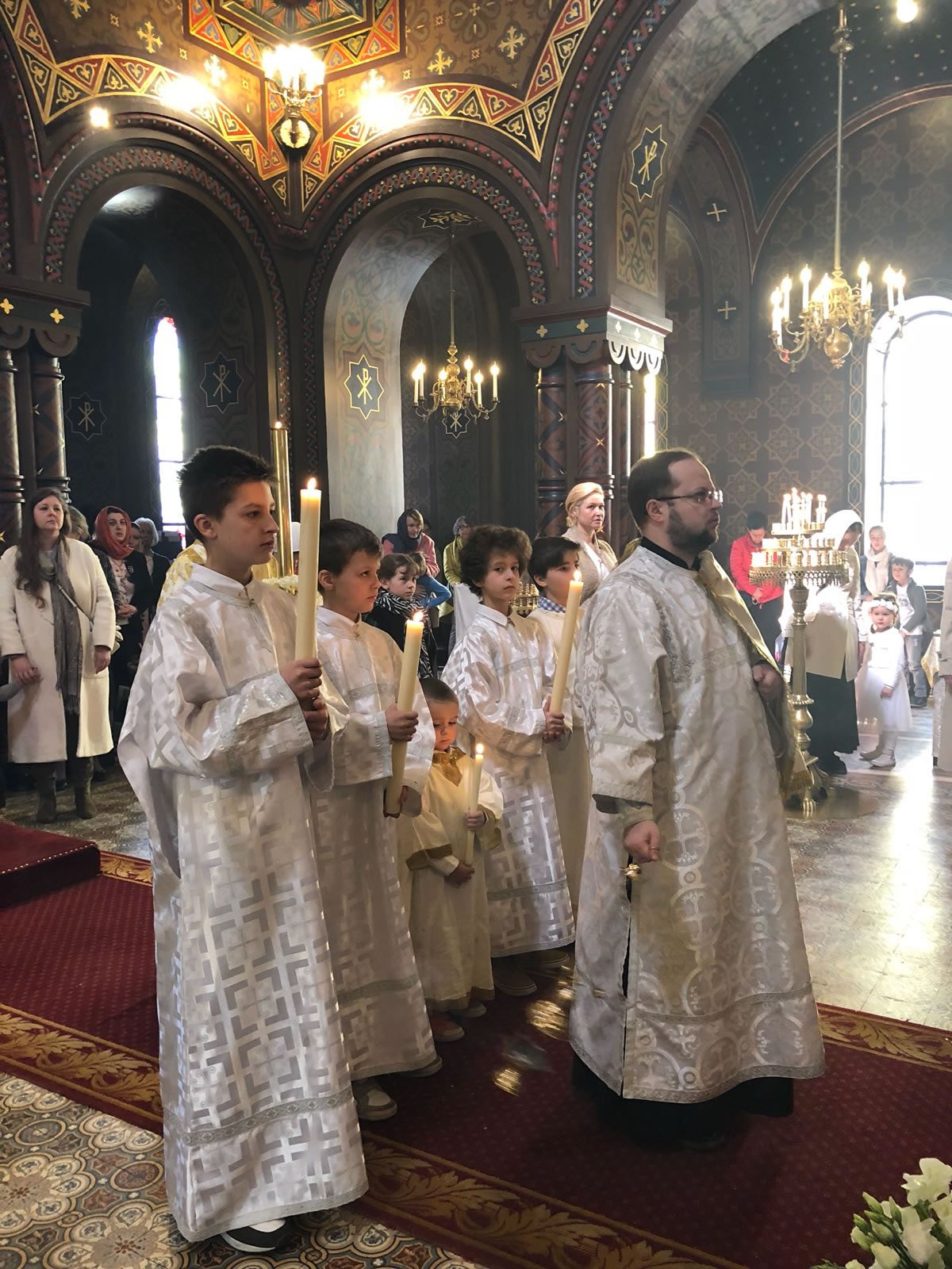 On Great Saturday, April 7, 2018, midnight office at Elevation of the Holy Cross Cathedral in Geneva, Switzerland, began at 11:30 pm. A procession of the cross under the peal of bells exclaimed to the city the Risen Christ the Savior. Divine services, including Liturgy, were led by Protopriest Pavel Tsvetkoff along with Protopriest Emilian Pochinok and the cathedral’s deacons. The joyous declaration “Christ is Risen” was made in over ten languages to the multi-national cathedral parish. The cathedral choir sang artfully under the direction of Larisa Popovich and Mathew Malinin. After Divine Liturgy, the Paschal epistle of His Holiness Patriarch Kirill of Moscow and All Russia was read.