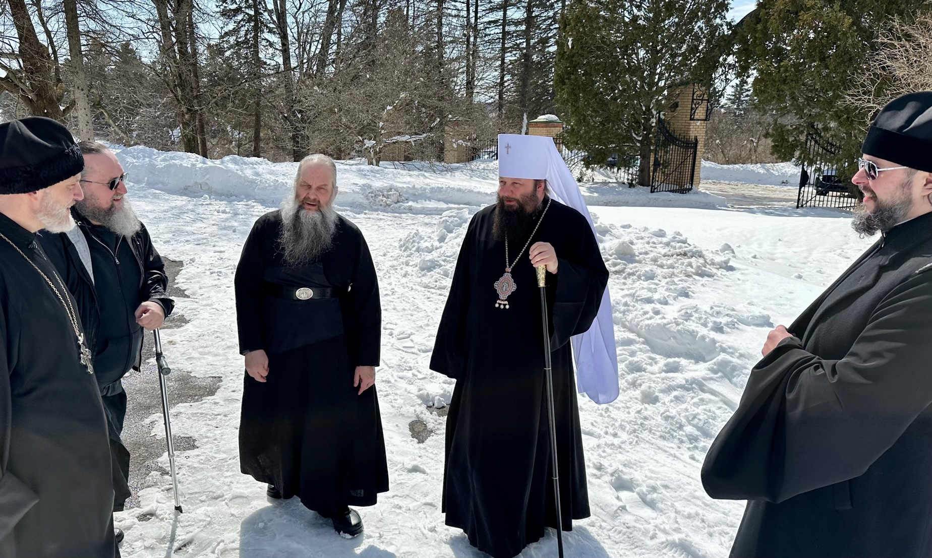 On Thursday, 16 March, 2023, the fifteenth anniversary of the repose of Metropolitan Laurus of blessed memory, His Eminence Metropolitan Nicholas of Eastern America and New York, First Hierarch of the Russian Orthodox Church Outside of Russia, visited Holy Trinity Monastery in Jordanville, NY. His Grace Bishop Luke greeted the Primate and invited him to the Abbot’s reception for a meeting.