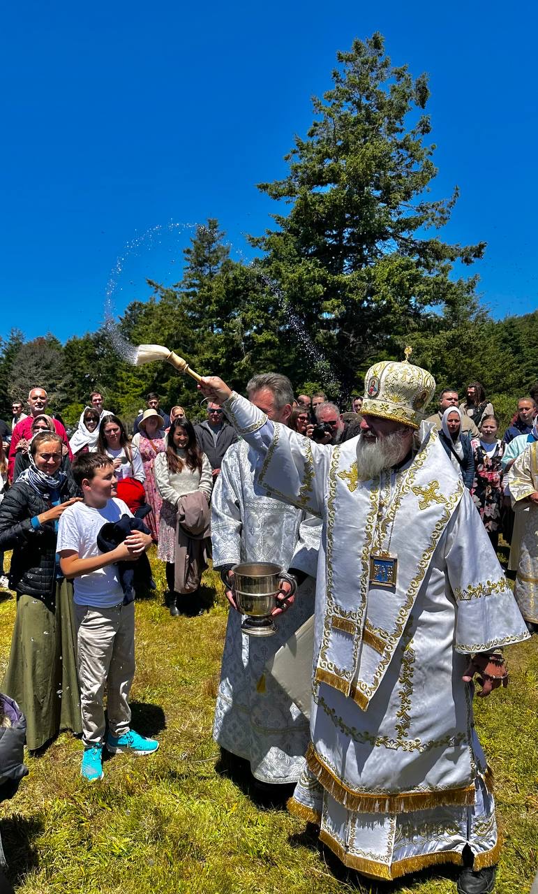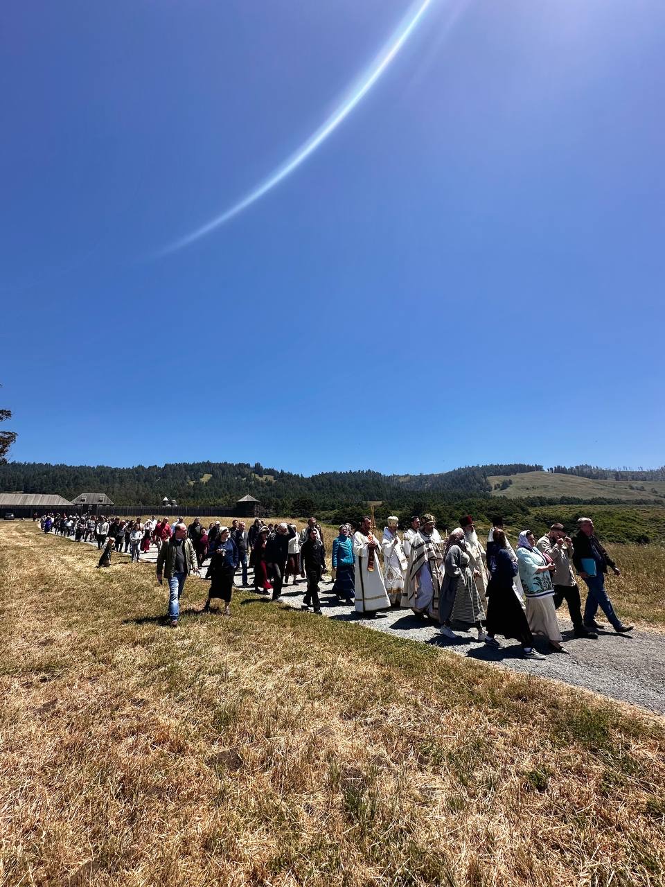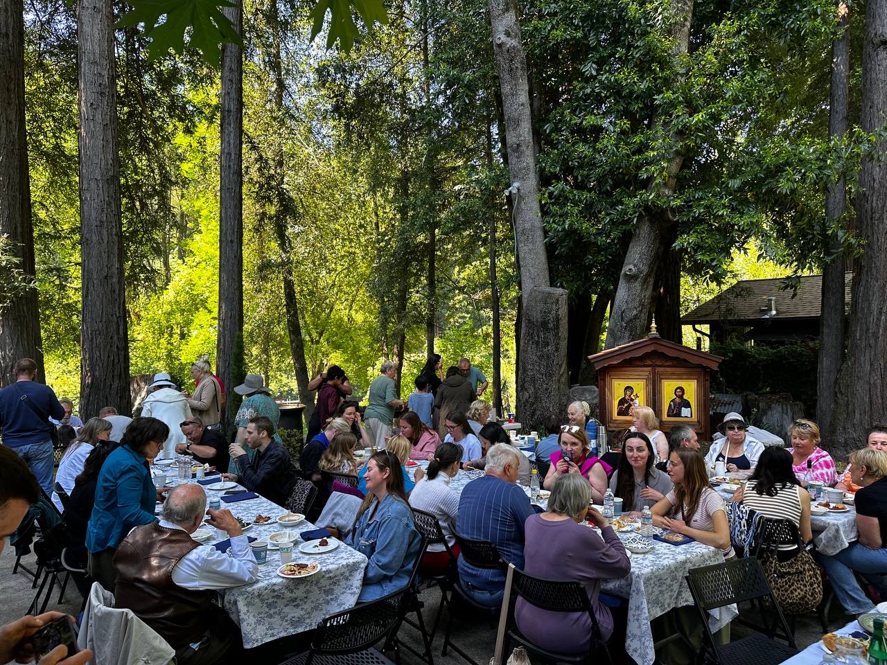 At the end of Divine Liturgy, a multitude of pilgrims and clergy marched in procession to the burial place of the Russian colonists, where a memorial litiya was performed. After the service, the pilgrims went to the Church of the Kazan Icon of the Mother of God on the Russian River, where a festive luncheon was offered to everyone.