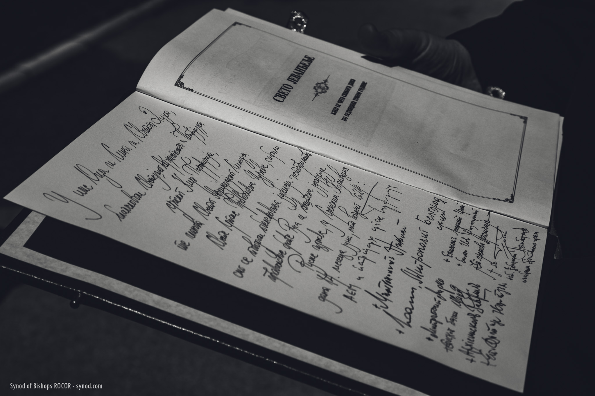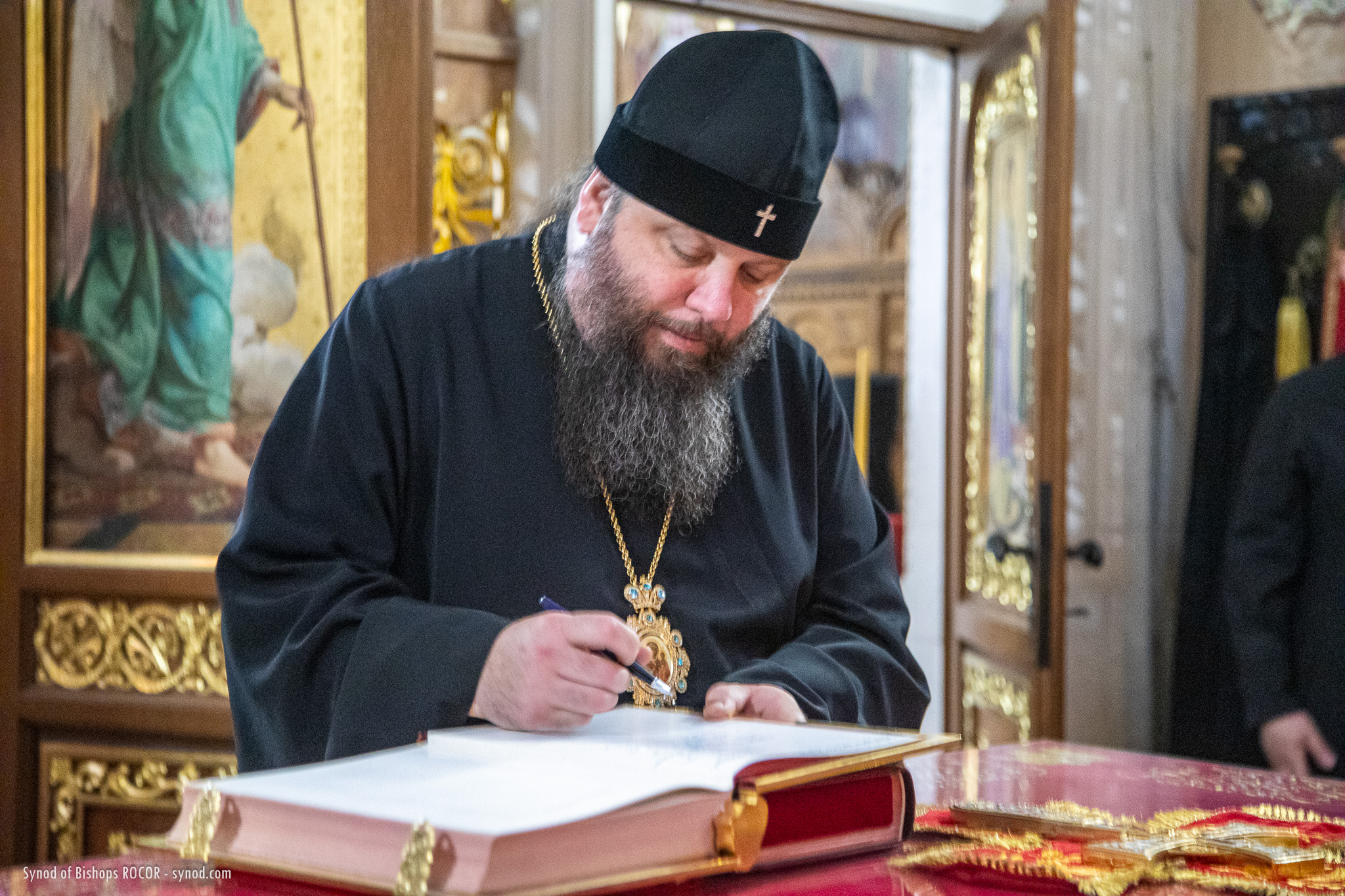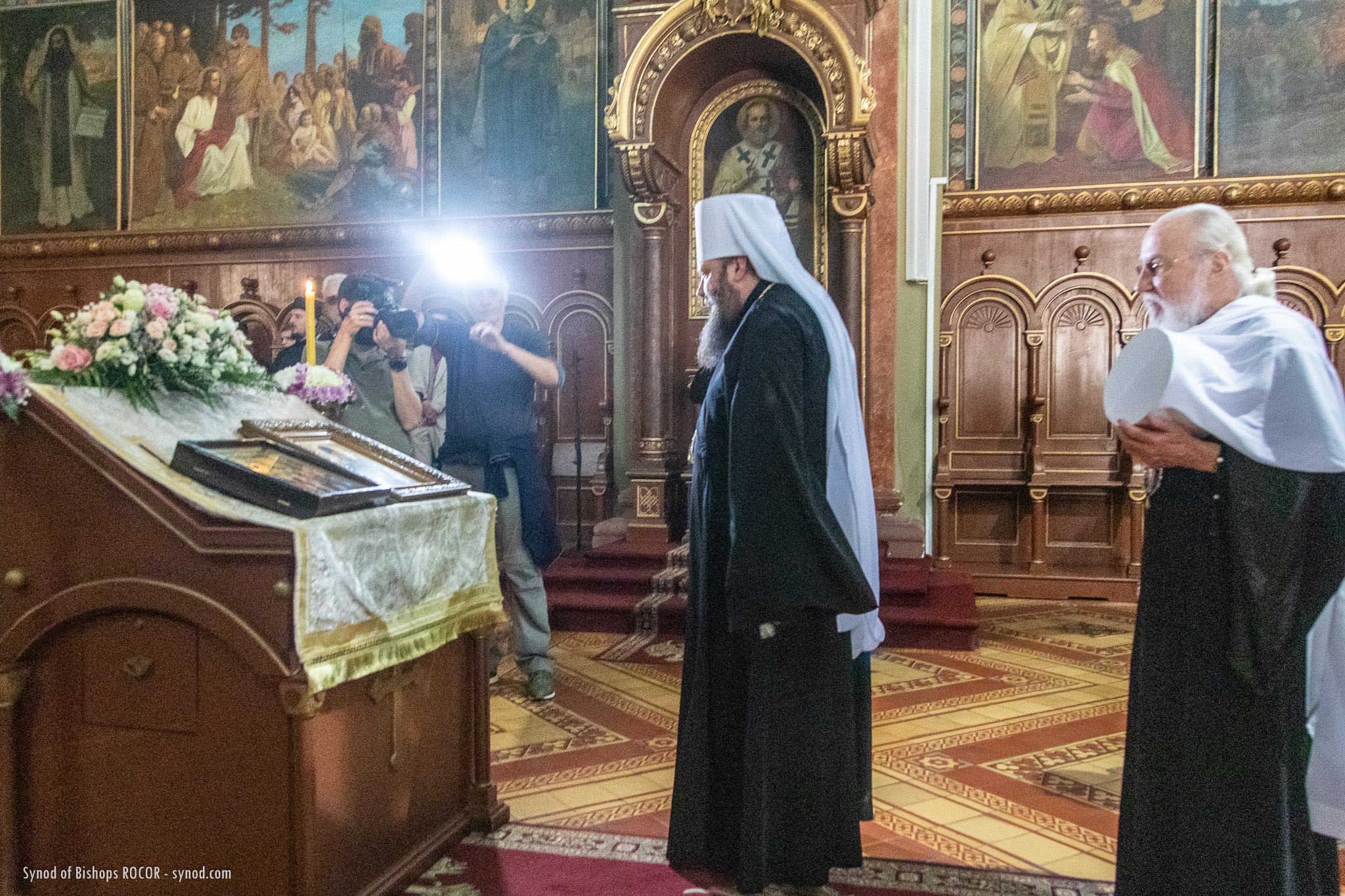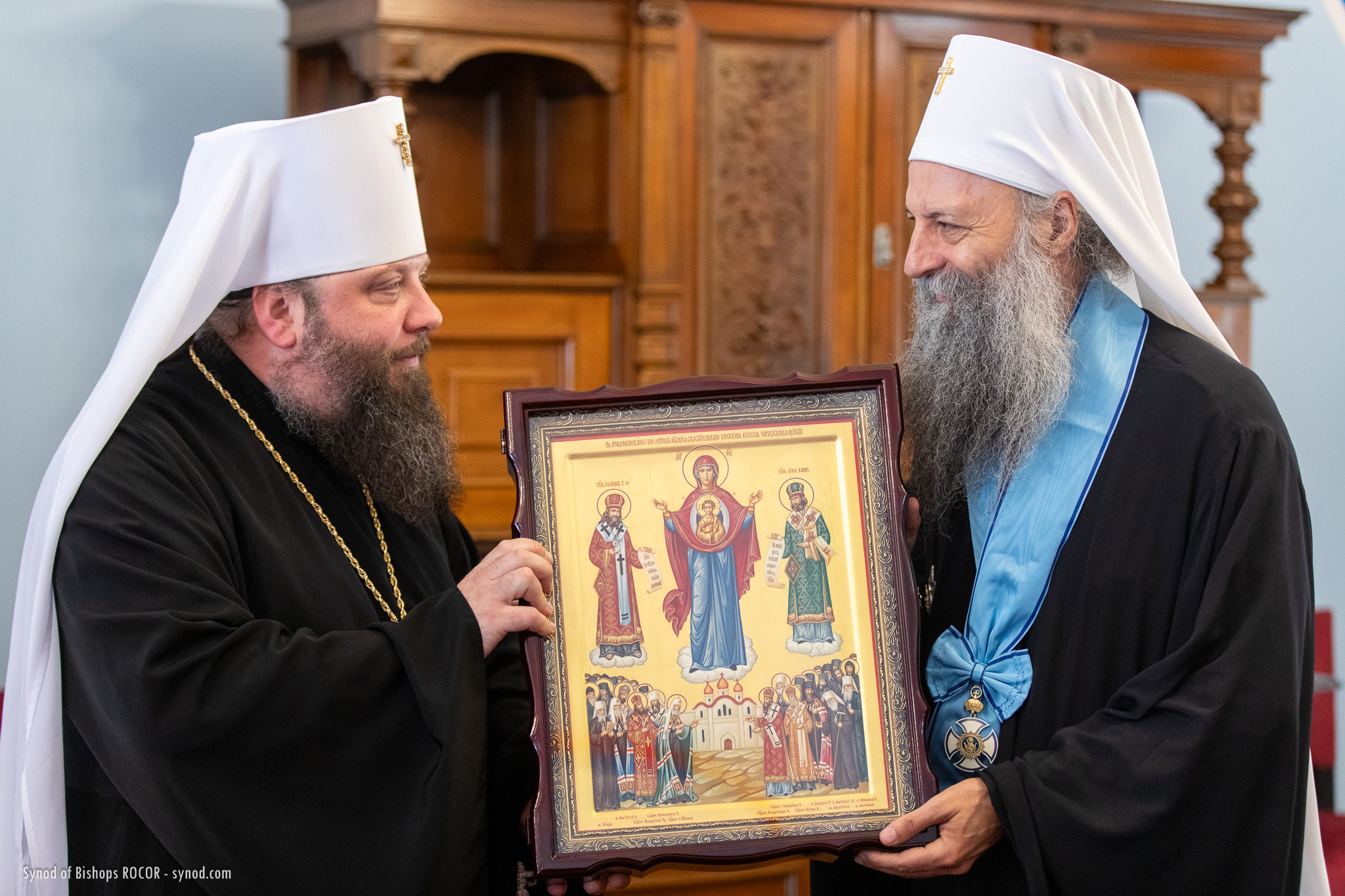 After a prayer and opening words by His Holiness, Metropolitan Nicholas delivered a welcoming speech, at the end of which he awarded His Holiness with the Synodal Order of the Kursk-Root Icon of the Mother of God “of the Sign,” 1st Degree, and gave the Primate an icon of the Mother of God depicted together with St John of Shanghai and St Jonay of Hankow, along with the Holy New Martyrs and Ascetics of the Russian diaspora painted to mark the centennial of the Russian Orthodox Church Outside of Russia, as well as a panaghia as a memento.