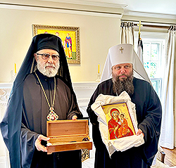 On Tuesday, 17 September, 2024, His Eminence Metropolitan Nicholas of Eastern America and New York visited the residence off His Eminence Metropolitan Saba, Primate and Archbishop of the Antiochian Orthodox Church of North America. During a luncheon, the two hierarchs had a warm, fraternal discussion of the life of the Holy Church of Christ, her pastoral and missionary service, youth ministry and inter-Orthodox relations. At the end of the meeting, the bishops exchanged mementos of the visit, wishing each other Divine aid. Metropolitan Saba gave Metropolitan Nicholas a reliquary with a part of the uncorrupt mantle of St Raphael of Brooklyn, recently obtained along with his relics. The Primate of the Russian Church Abroad promised to find a prominent place for the holy shrine.