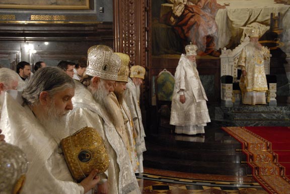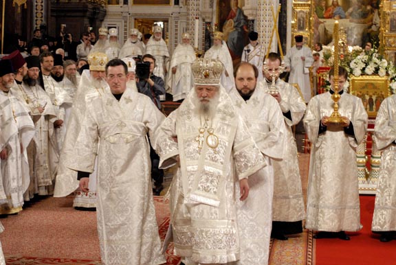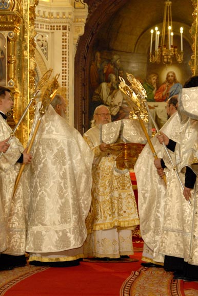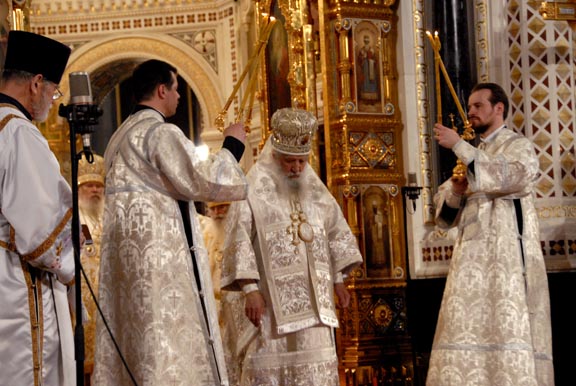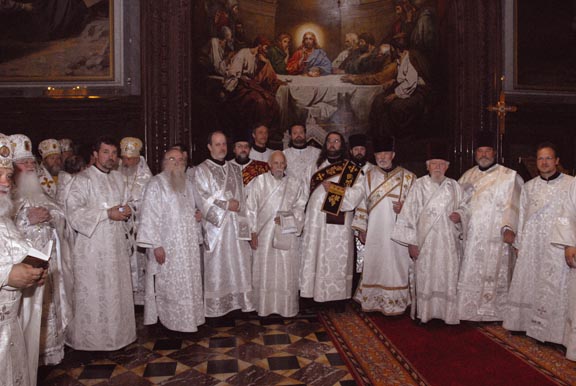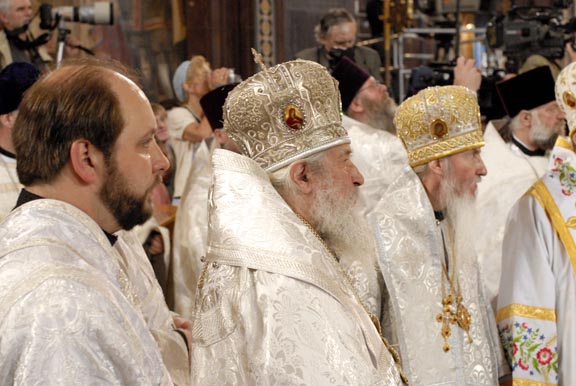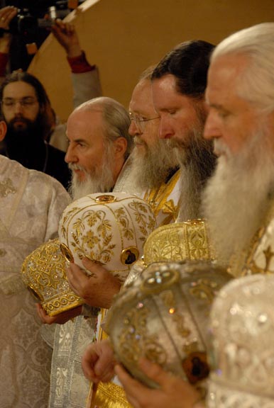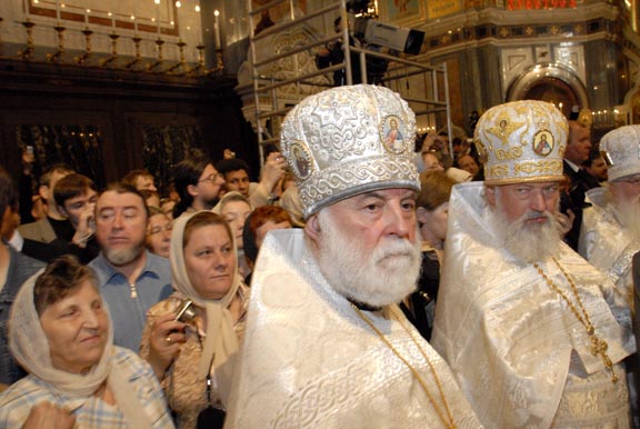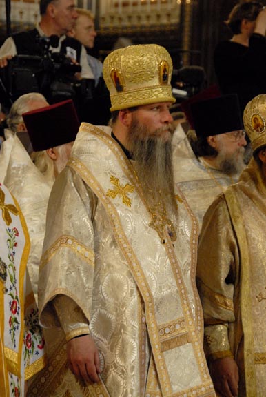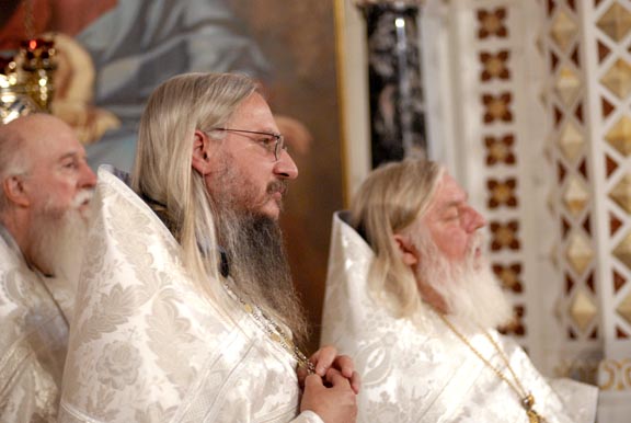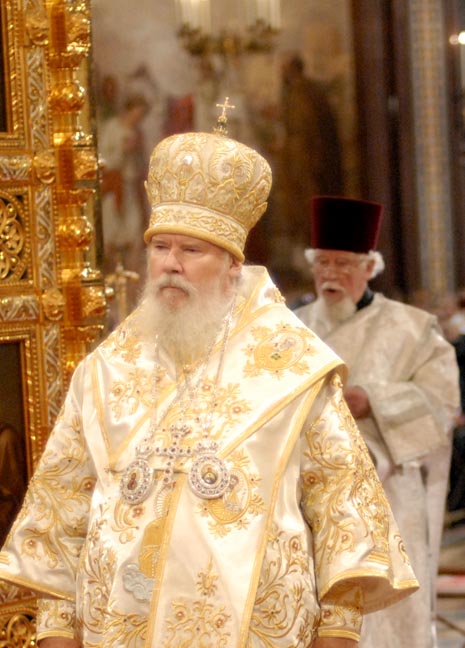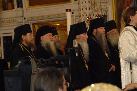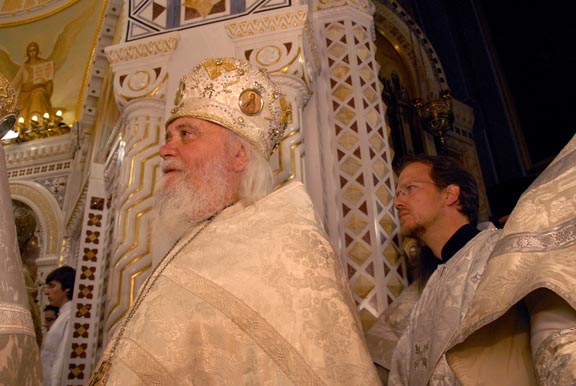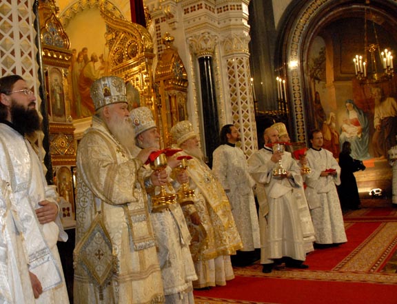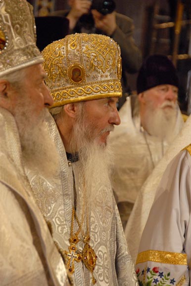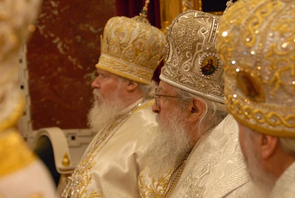Greeting His Holiness Patriarch Alexy II of Moscow and All Russia were the archpastors of the Russian Orthodox Church Outside of Russia and members of the Holy Synod of the Moscow Patriarchate, plus Archbishop Innokenty of Korsun and Archbishop Evgeny of Verey, members of the Moscow Patriarchate's Commission, who all emerged together through the Royal Doors wearing white vestments.