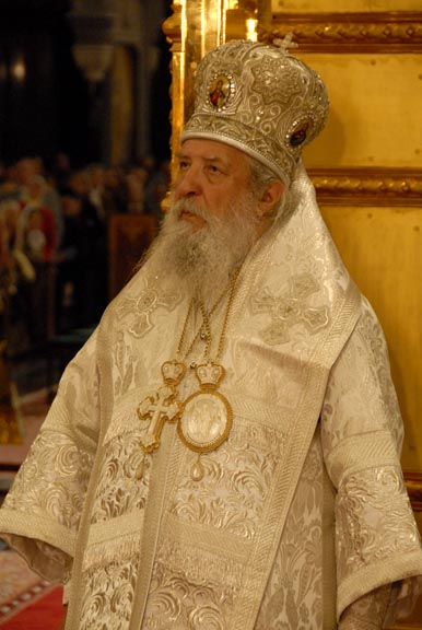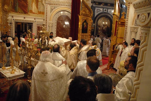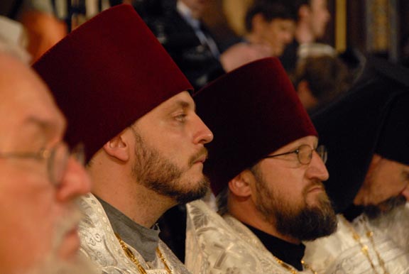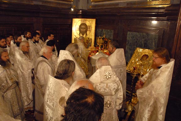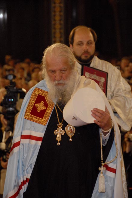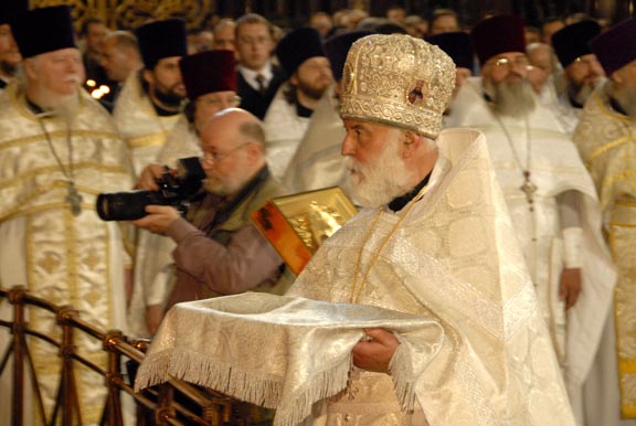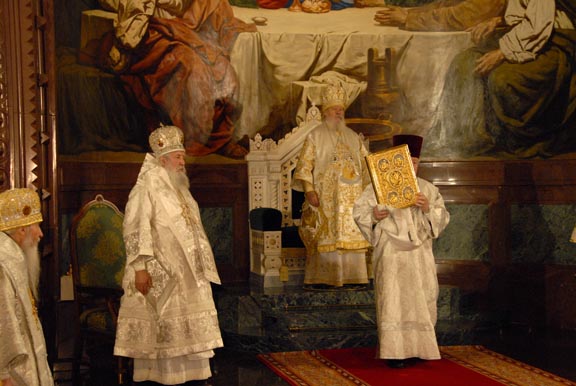 Donning the mantle, His Holiness blessed the bishops and clergymen with the cross, after which he ascended the cathedra in the middle of the church. As His Holiness Patriarch Alexy II entered the church, His Eminence Metropolitan Laurus of Eastern America and New York proceeded to the cathedra. Standing on the north and south sides were the bishops and clergymen of the Russian Orthodox Church Outside of Russia and the Moscow Patriarchate.