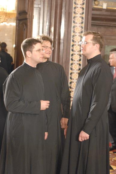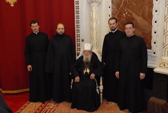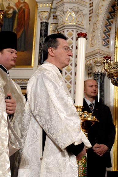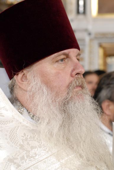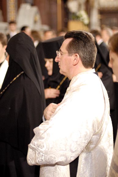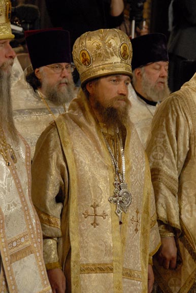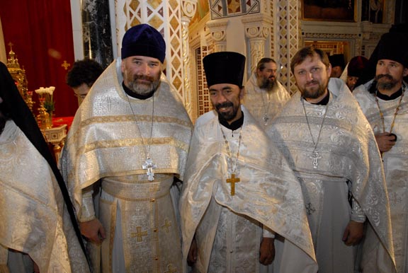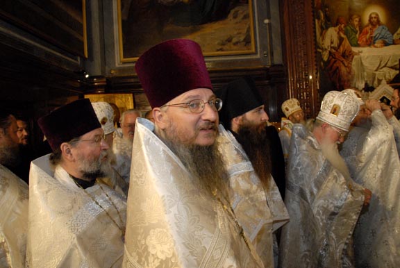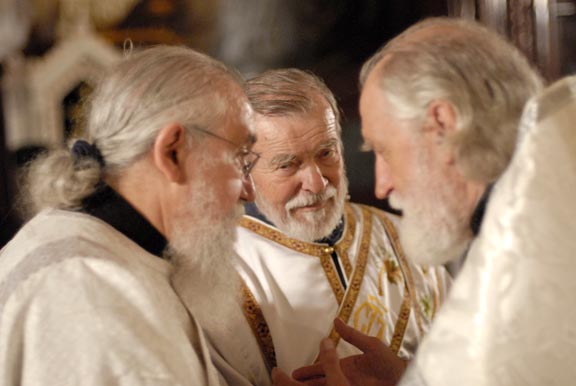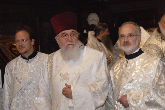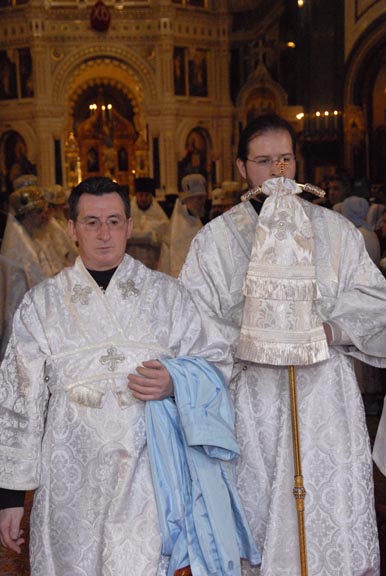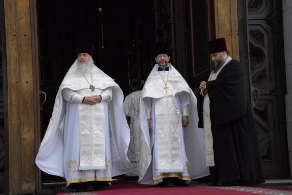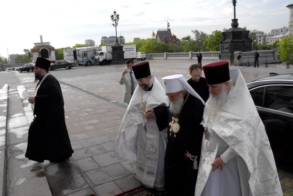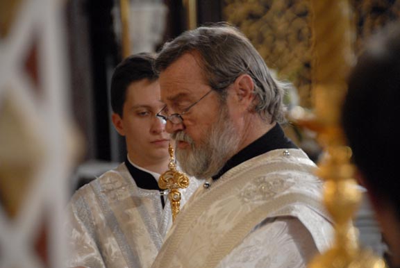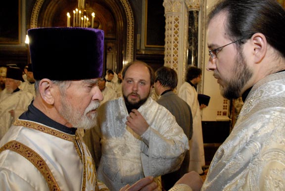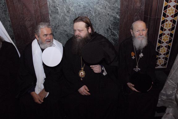 During the proskomedia, the First Hierarch of the Church Abroad arrived. His Eminence was greeted by the Secretary of the Commission of the Russian Orthodox Church Outside of Russia on talks with the Moscow Patriarchate, Protopriest Alexander Lebedeff, and the Secretary of the Commission of the Moscow Patriarchate on talks with the Church Abroad, Protopriest Nikolai Balashov. Clergymen of the Moscow Patriarchate emerged from one of the side altar doors to greet His Eminence, and an equal number of clergymen of the Russian Orthodox Church Outside of Russia from the other side. Venerating the altar-table cross, His Eminence Metropolitan Laurus blessed the clerics and worshipers with it, and then entered the altar.