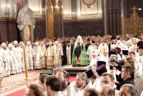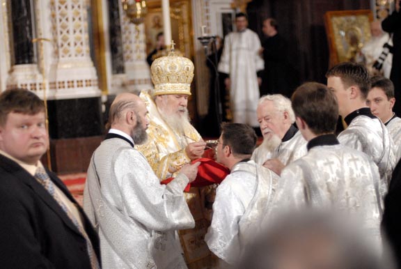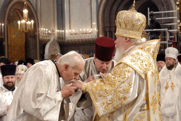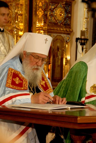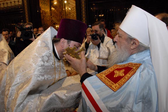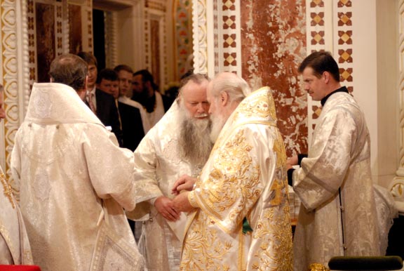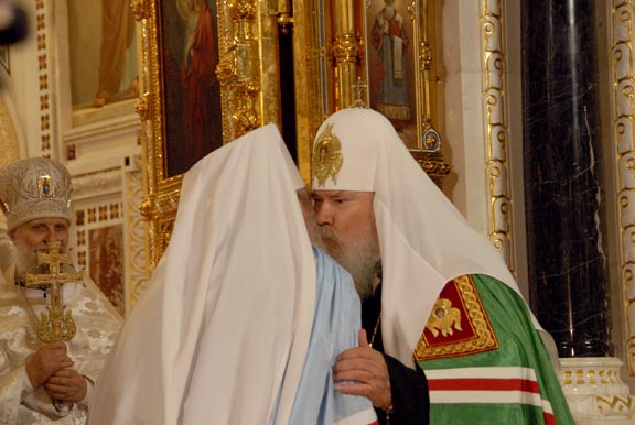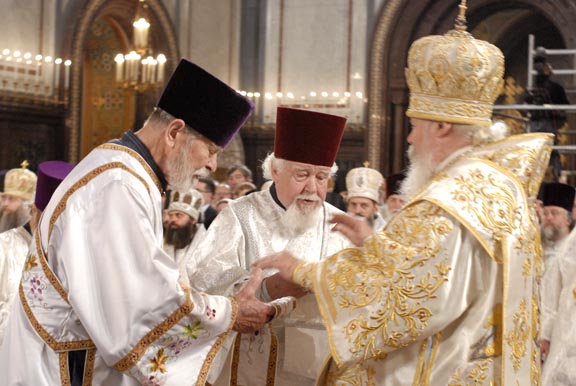 The Act was then signed on the ambo of Christ the Savior Cathedral. His Holiness Patriarch Alexy II of Moscow and All Russia and His Eminence Metropolitan Laurus of Eastern America and New York put their signatures under this historic document. Then, with the words “Christ is among us! Now and forever,” they kissed each other three times.
