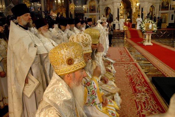After the troparions, sung in turn by the unified choir of the Russian Orthodox Church Outside of Russia and by Holy Trinity-St Sergius Lavra Choir, His Holiness Patriarch Alexy II of Moscow and All Russia read a special prayer which included the words: “As Thee lifted Thy prayers to Thy Heavenly Father for Thy disciples, that they all be as one, gaze now with Thy merciful eyes upon Thy people, who have sinned and disobeyed Thy will, bless now our good intention and the unification of the Church to Your Glory, create this Thyself, dampen all church temptations and divisions. Having given to us Thy law to love Thee, our God, and our neighbor, deliver us from all insult and disruption, may brotherly love reign among the children of our Church, in the Fatherland and in the diaspora. Grant that we may now enter Thy temple and bring Thy bloodless sacrifice, that we may be unified in one body through communion with Thy Life-creating Body and Thy Honorable Blood and bring praise with all our hearts to Thy ineffable love for mankind.”