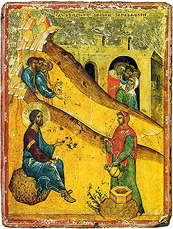 Путь Господа лежал через Самарию. Когда Господь Иисус Христос со Своими учениками подошел к городу Сихему как раз был полдень, время сильнаго зноя, что вызвало необходимость отдыха. Господь с учениками остановился у колодца, вырытаго, по преданию, патриархом Иаковом. Ученики отлучились в город купить пищи.