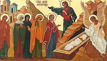 Но как только вид бездыханнаго Пречистаго Тела Христова утолил на время злобу иудеев, Мироносицы Жены, проведши безсонную ночь, чуть свет, рано поутру, уже спешили ко гробу, чтобы излить безпрепятственно всю свою любовь к своему Учителю и Наставнику этим последним, погребальным помазанием благоухающаго мира.