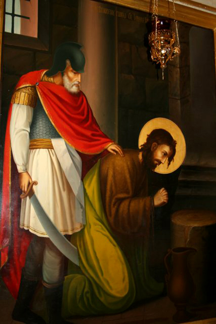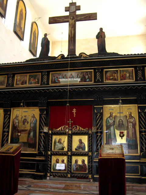 This discovery was acknowledged by experts throughout the world. The Russian Consulate decided to build on another site, and a church was built over this final leg of the Way of the Cross, elevated upon a wide court rising over the Gates, apparently a part of Constantine the Great's church. A stone altar table was found there, apparently part of a chapel in that church, which had once covered a whole series of holy sites. This altar table was left in place, and an altar and iconostasis were built to the east, the church then dedicated to St Alexander Nevsky. The Holy Threshold is found in this edifice, which also contained some rooms to accommodate pilgrims. The threshold is covered by a wood and glass display case. Beyond it is a large Crucifix on a shard of original stone. An ancient wall stretches out on the left, abutting a wall upon which is a large icon of the Savior carrying the Cross. These massive remains extend past the Russian parcel and continue as part of the adjacent Abyssinian monastery.